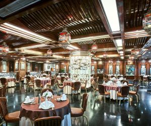 Phòng suite ấn tượng trên một chiếc du thuyền, khác hẳng với các bức ảnh nội thất trước đó, mặc dù cả hai đều được làm đồ gỗ óc chó đánh bóng