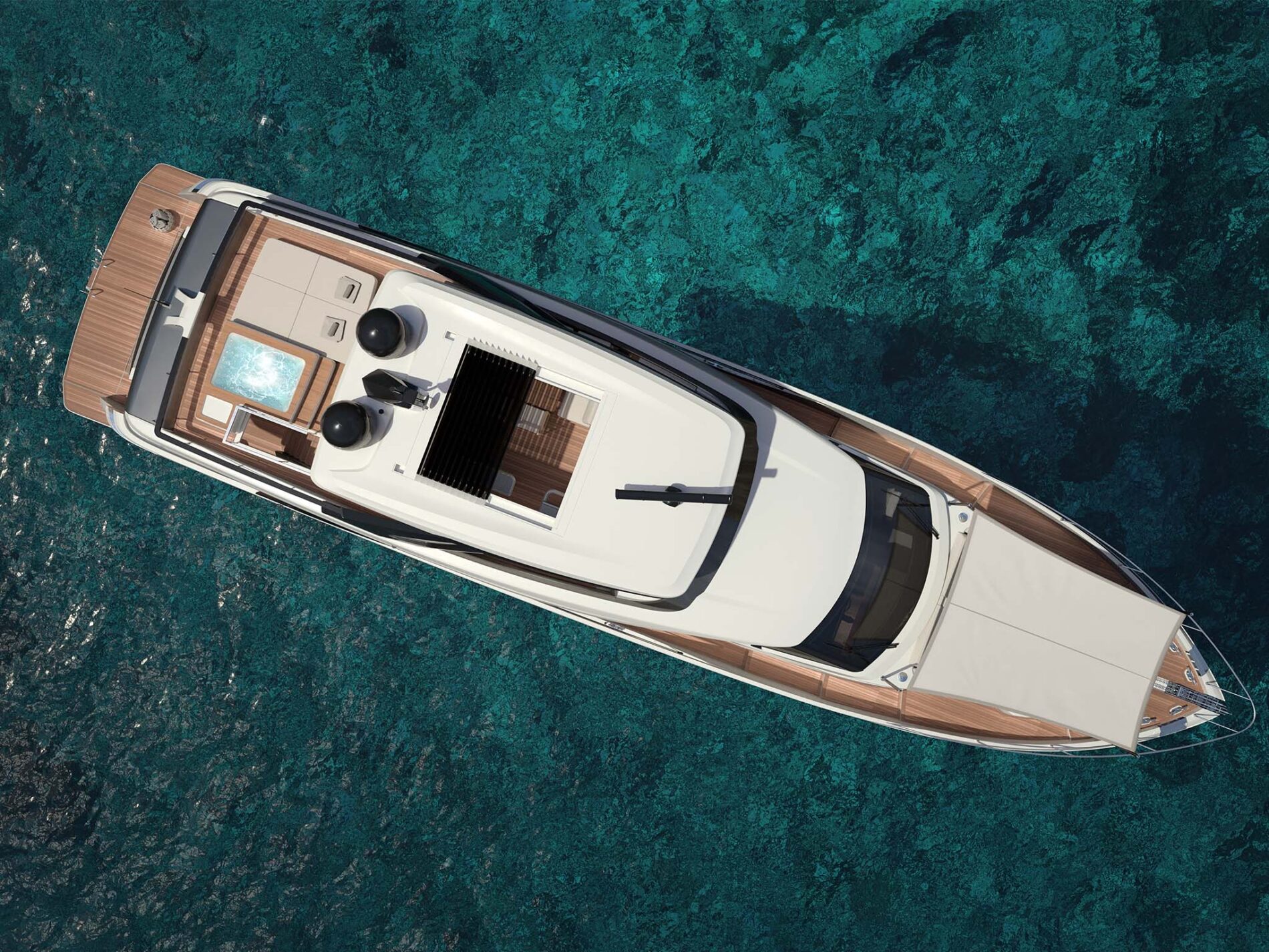 Các khu vực ngoài trời bao gồm buồng lái phía sau, nơi có hai ghế sofa đối diện và một bàn trung tâm lớn cùng với lan can kính. Khu vực bãi biển có thể được đi vào từ hai bên và có lối vào garage, nơi có thể chứa hai đồ chơi dưới nước, một tàu đổ bộ 3,95m và một chiếc jetski hai chỗ ngồi.