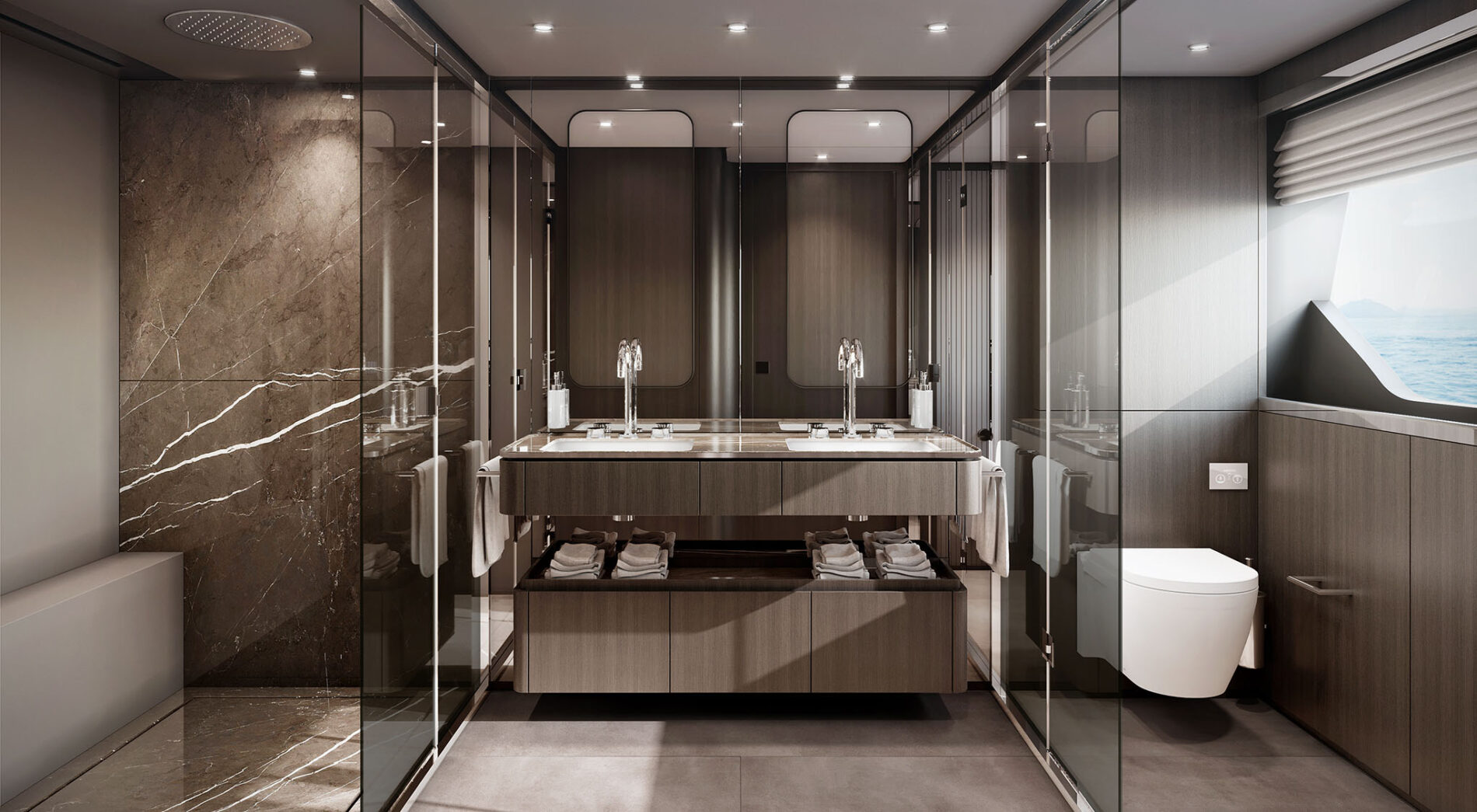 Tầng dưới có 4 cabin với phòng tắm riêng – phòng chính ở giữa tàu, phòng khách VIP phía trước, phòng giường đôi và phòng 2 giường đơn. Nhà bếp được thiết kế đa chức năng dựa trên các yêu cầu của khách, với buồng lái nhô cao về phía trước, tách biệt rõ ràng với khu vực dành cho khách. Lối đi được sắp xếp để tăng sự riêng tư cho chủ sở hữu và khách. Phòng bếp bày và khu vực dịch vụ được ngăn cách với khách bằng cửa trượt và buồng lái có lối đi thẳng tới khu thủy thủ đoàn, nơi có hai cabin đôi với phòng tắm riêng.