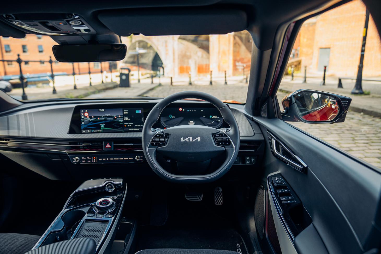 Bảng điều khiển của EV6 kết hợp các chi tiết hiện đại và chủ nghĩa chức năng đơn giản. Kết hợp màn hình cảm ứng với các điều khiển analog là một cách tiếp cận hiện nay quen thuộc với nhiều nhà sản xuất, với các nút trên tay lái thực hiện nhiều công việc mà người lái xe không cần phải nghiêng người để chạm màn hình. Một màn hình hiển thị điều hướng thực tế tăng cường mang lại cho EV6 những chức năng cơ bản giống như Mercedes EQS – một chiếc xe trong phân khúc hạng sang. EV6 là tương lai, nhưng không quá xa vời. Một bộ nút xoay lớn để sang số, giống như trong nhiều loại xe tự động thông thường.