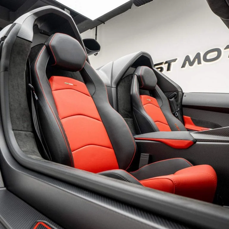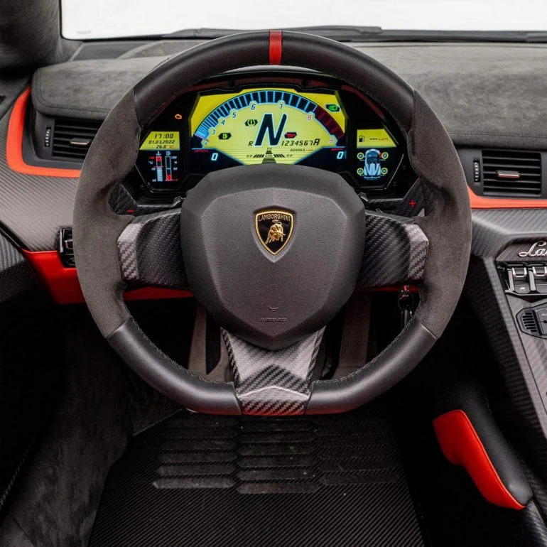 Sự phối màu tương phản được tiếp tục ở bên trong với ghế bọc da tông màu đỏ và đen. Cabin cũng có nhiều chi tiết chèn bằng sợi carbon mờ, vải Alcantara màu đen và nắp công tắc bật tắt được sơn theo màu cờ Ý. Siêu xe được trang bị động cơ V12, hút khí tự nhiên, dung tích 6,5 lít của Lamborghini, được tùy chỉnh để sản sinh công suất 750 mã lực.