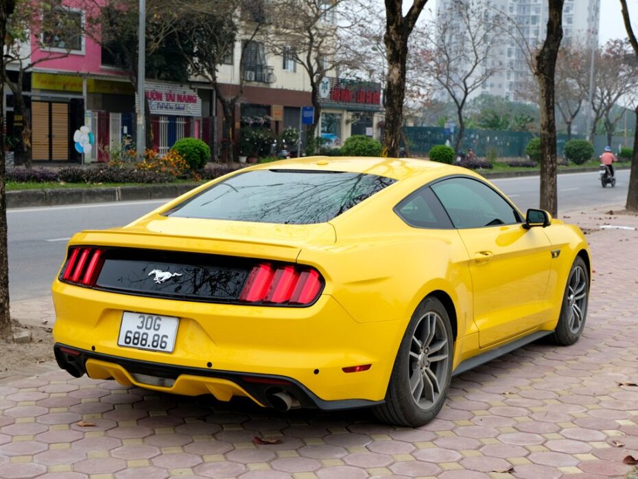 Ford Mustang – một chiếc cơ bắp Mỹ và BMW i8 – chiếc xe thể thao có dáng vẻ nuột nà đến từ Đức, cùng được rao bán đồng thời. Cả hai chiếc đều thuộc đời 2015 và thú vị hơn là cùng mang biển số đẹp. Biển số chiếc Mustang là 688.86. Theo những người sưu tầm SIM và biển số đẹp, số 6 có ý nghĩa là lộc, còn số 8 mang ý nghĩa phát. Biển số này còn được gọi là “gánh” bởi sự đối xứng của các con số trong dãy số. Hồi năm 2015, một chiếc Mustang màu vàng khá nổi bật. Dải đèn màu cam cho thấy xe được sản xuất cho thị trường Mỹ.