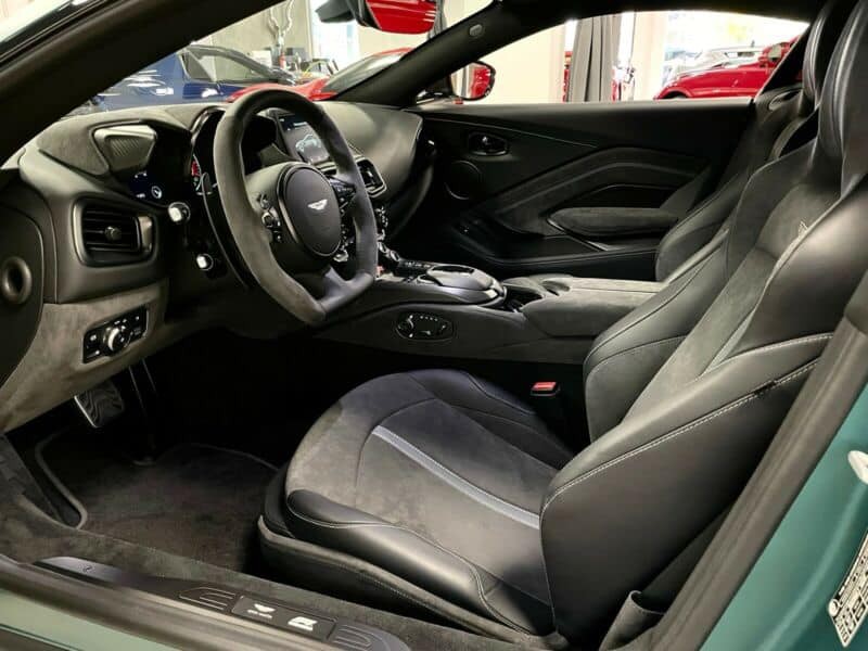 Khi tiến vào khoang lái, chúng ta sẽ bị thu hút bởi ghế ngồi bọc da Alcantara màu xám kèm sọc xanh lá nổi bật, bảng điều khiển trung tâm carbon có logo F1, bên cạnh bậc cửa có logo phiên bản đặc biệt “F1 Edition”.