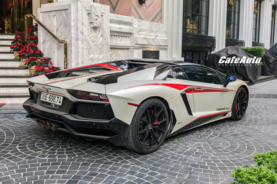 Sau thời gian dài về Việt Nam, chiếc Lamborghini Aventador LP700-4 Roadster của tay chơi Hà Nội đã lột xác với diện mạo mới bắt mắt hơn. Thay vì dán decal phủ kín, “siêu bò” này chỉ dán những điểm nhấn ở ngoại thất màu đỏ và đen. Cản trước với hốc gió dán màu đen và đường viền góc cạnh màu đỏ.