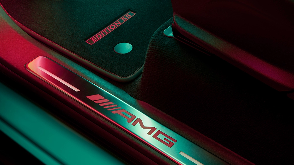 Trong khi đó, bên trong cabin được đặc trưng bởi sự tương phản của màu đỏ và đen. Ghế AMG được bọc bằng da nappa hai tông màu trong khi thảm sàn màu đen được trang trí bằng chỉ khâu màu đỏ “Edition 55”. Ngoài ra còn có dòng chữ “AMG” được chiếu sáng màu đỏ tại bậc cửa, cùng với các huy hiệu “AMG” và “55” trên vô lăng AMG Performance. Bạn cũng có thể mong đợi nhiều chi tiết cacbon xuyên suốt cabin.