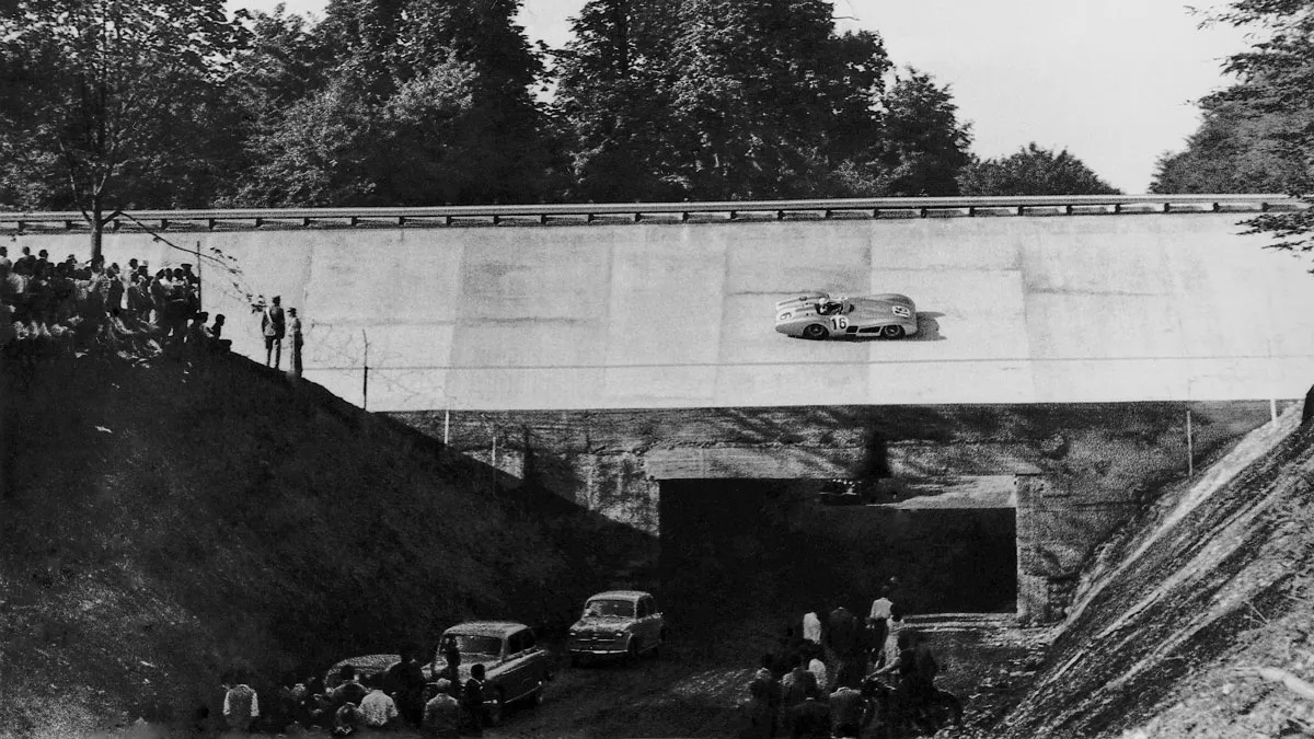 1954 Mercedes-Benz W 196 R ‘Stromlinienwagen’ – cr mercedes-benz AG – Luxuo 5 ← Previous Next → Stirling Moss lái xe trên đường đua dốc ở Monza, trong khuôn khổ Giải đua ô tô Grand Prix tại Ý năm 1955. Ảnh: Mercedes-Benz AG