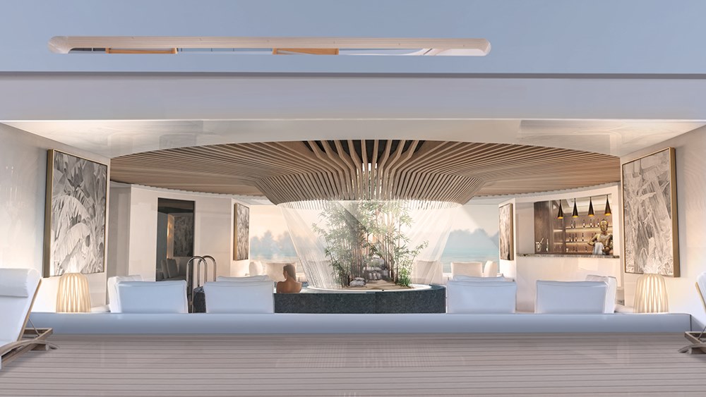 Beach club nằm ở khu vực boong chính có một bể sục và quầy bar. Trên boong này cũng được thiết kế một khu vực bếp mở đầy tinh tế, cũng như bốn cabin có thể chứa 08 khách.