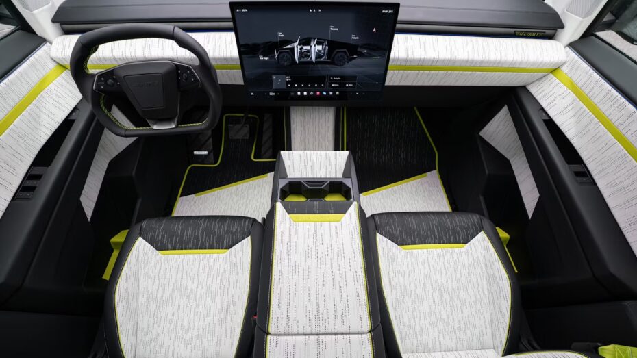 Bên trong nội thất của Tesla Cybertruck Elongation được chế tác từ da cao cấp và sợi carbon, có sự kết hợp giữa màu xám, trắng và vàng. Khách hàng có thể tùy chỉnh đặt hàng bề mặt cứng với nhiều carbon hơn theo mong muốn của bản thân.