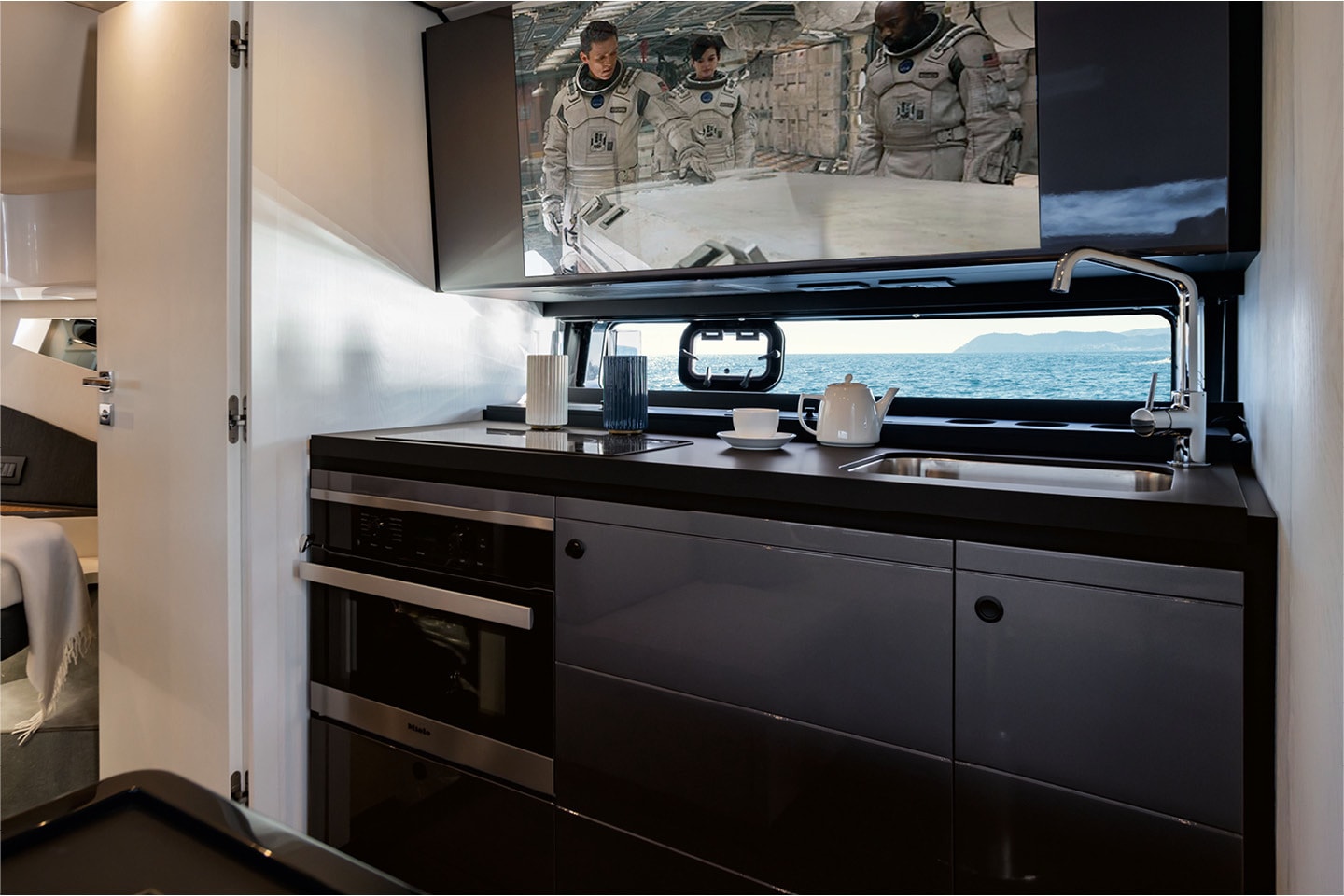 Verve 47 có boong trên và dưới thoáng đãng với ghế ngồi thoải mái, phòng ngủ đủ loại, bếp, bảng điều khiển đa chức năng và hệ thống âm thanh đầy đủ. Michael Peters là người đảm nhận cho thiết kế xa hoa của thân tàu.