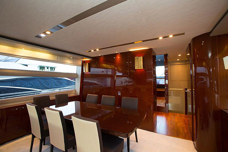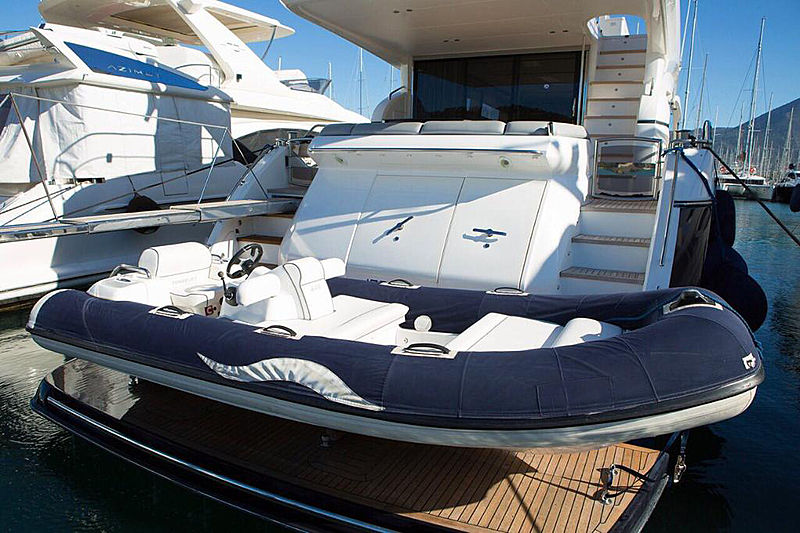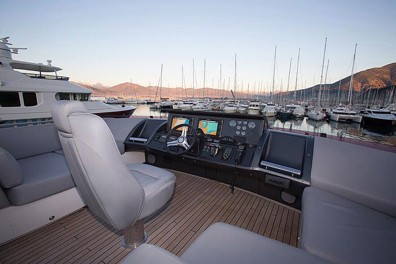 Bên ngoài, boong phía sau cung cấp nơi hoàn hảo cho việc ăn uống ngoài trời và được trang bị một quán bar, cũng như flybridge có vỉ nướng, mái che thủy lực và hệ thống âm thanh. Buồng lái và cầu được trang bị những chiếc ghế cong cho nhiều lựa chọn ăn uống ngoài trời hơn và khách có thể thư giãn trên tấm chắn nắng lớn. Du thuyền cũng đi kèm với thuyền phao Williams 445.