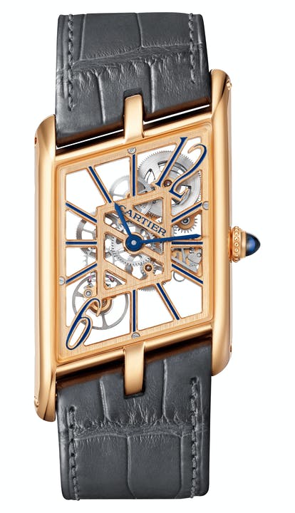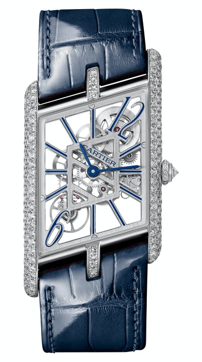 Trong một động thái bất thường, các chữ số và cọc giờ được khảm bằng sơn mài màu xanh để bổ sung hợp lý cho kim bằng thép mờ, trong khi dây đeo bằng da cá sấu bóng loáng được trang bị khóa ardillon. Tank Asymétrique Skeleton có bản bạch kim và vàng 18 cara, vỏ được nạm đá quý với 250 viên kim cương cắt brilliant, mỗi phiên bản quyến rũ này cũng chỉ được giới hạn trong 100 chiếc.