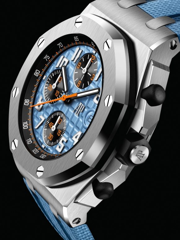 Royal Oak Offshore Chronograph 42mm xuất hiện dưới hai phiên bản khác nhau gồm bản lắp vỏ thép không gỉ và titan siêu nhẹ, cả hai đều có núm vặn cùng nút bấm chức năng bằng cao su đen bền bỉ. Theo đó, mẫu thép không gỉ có mặt số màu xanh lam nhạt trang trí hoa văn Méga Tapisserie – được giới thiệu lần đầu tiên trong bộ sưu tập Royal Oak Offshore vào năm 2001, nổi bật trên đó là 3 bộ đếm màu đen. Các chuyên gia đã khéo léo sử dụng sắc cam phủ lên các chữ số của bộ đếm giờ và kim giây trung tâm nhằm tối ưu hóa độ hiển thị.