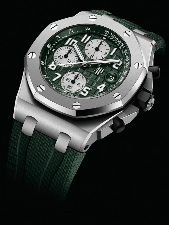 Riêng bản lắp vỏ titan lại sở hữu mặt số Méga Tapisserie màu kaki, rìa xoay tích hợp thang đo đồng điệu với tổng thể được tô điểm bằng các bộ đếm có tông màu bạc, cùng cọc số và các kim phủ dạ quang trắng. Bên việc bổ sung màu sắc mới là sự thay đổi về logo. Giờ đây, chữ AP tự hào ngự trị tại vị trí 3 giờ, mang lại cảm giác mới mẻ, thể thao hơn.