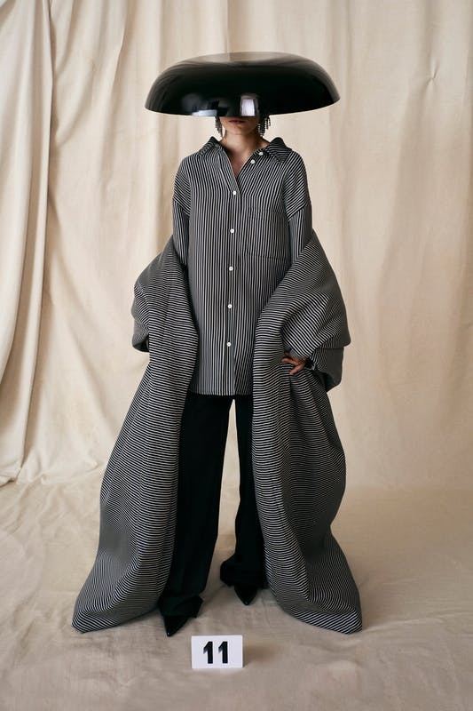 Cuộc chơi với “biên độ” vải tiếp diễn khi càng về sau, các thiết kế càng trở nên đồ sộ và phức tạp hơn. Suits được kết hợp cùng những chiếc áo khoác phao phồng to, jeans kết hợp cùng lông vũ và da thuộc kết hợp cùng vải dạ, một tổng thể rất thách thức, đối lập nhưng thú vị. Hình ảnh Balenciaga huyền thoại tiếp tục xuất hiện khi chúng ta được chứng kiến bộ jumpsuits lụa bóng với phần nơ thắt ngay trước ngực, phô diễn toàn bộ phần vai và phối màu chấm bi trắng đen không còn xa lạ khi bản thân Cristóbal Balenciaga đã áp dụng chấm bi trong thiết kế rất nhiều lần. Những chiếc đầm cocktail với đường cổ và phần vai cách điệu cứng cáp xuất hiện song song với nón nhựa bóng che lấp khuôn mặt. Đầm dài chạm đất, cấu trúc thiên về khối cứng, chất liệu sequin lấp lánh và thậm chí in hoa tiếp tục mang lại một màu sắc cổ điển rất quen thuộc.