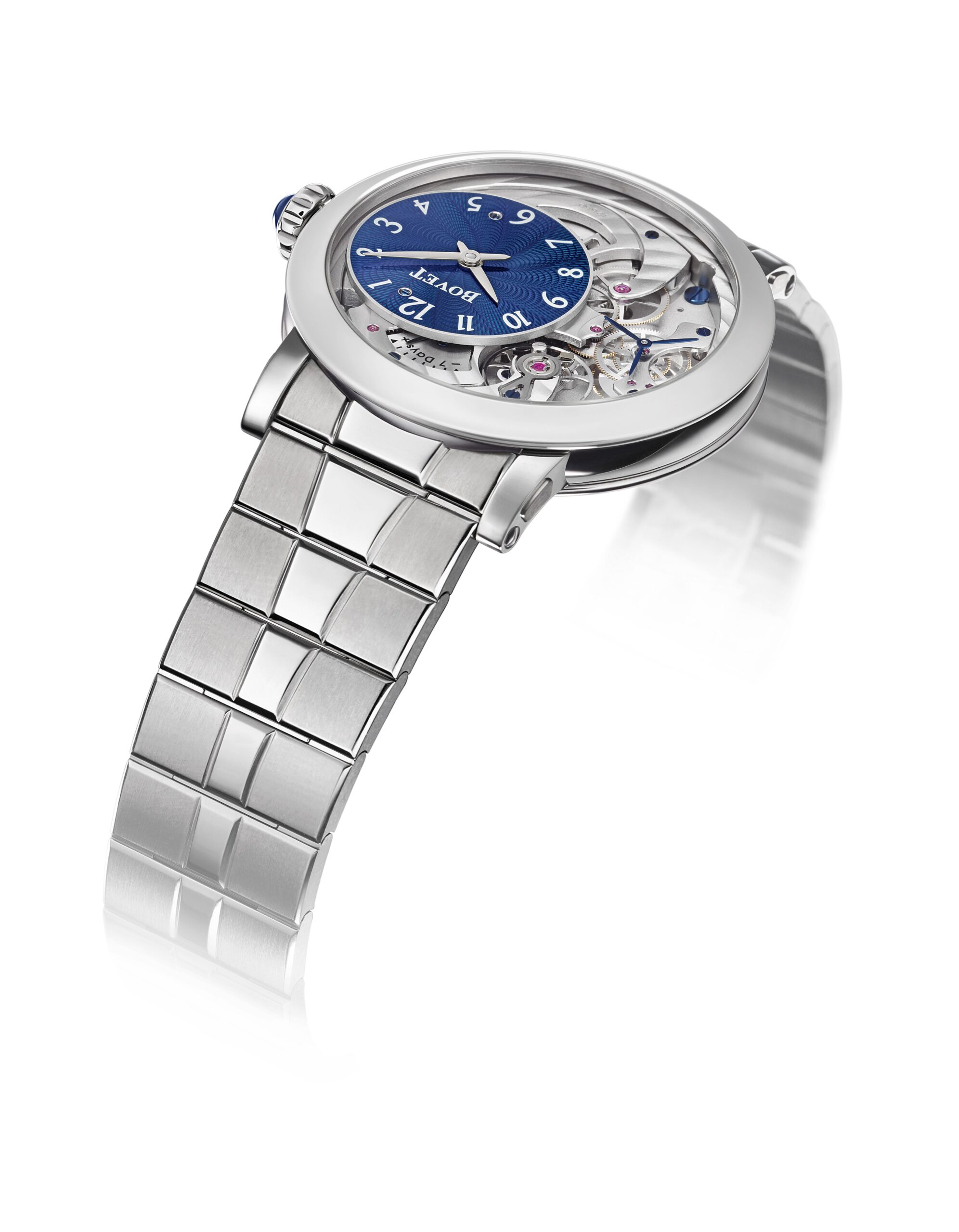 Phần mặt số được chế tác hoàn toàn in-house, nổi bật với họa tiết guilloche hình “Hoa sen” mang tính biểu tượng của BOVET, với 12 cánh hoa tượng trưng cho 12 giờ. Những con ốc màu xanh giúp giữ cố định mặt số và được phủ tám lớp sơn mài để gia tăng sự nổi bật cho chiếc đồng hồ. Ngay phía trên mặt số là chỉ báo dự trữ năng lượng giúp người chủ nhân có thể linh hoạt về thời gian trong khi sử dụng.