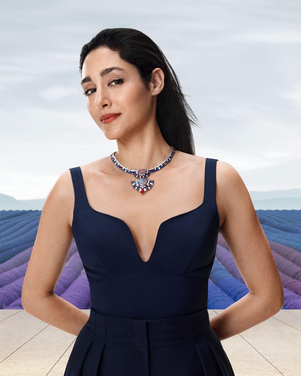 Thông qua bố cục trừu tượng, một màn trình diễn màu sắc lung linh gợi lên ý tưởng về sự kỳ diệu của côn trùng từ góc nhìn xa và rộng. Là một nhà nghiên cứu về màu sắc, Cartier dựa trên bảng màu đồ trang sức của mình với những màu sắc tươi sáng để thiết kế một chiếc quạt đồ họa và tương phản được căn chỉnh theo chiều dọc với một chiếc vòng cổ có bề ngoài cứng nhắc nhưng vô cùng dẻo dai.