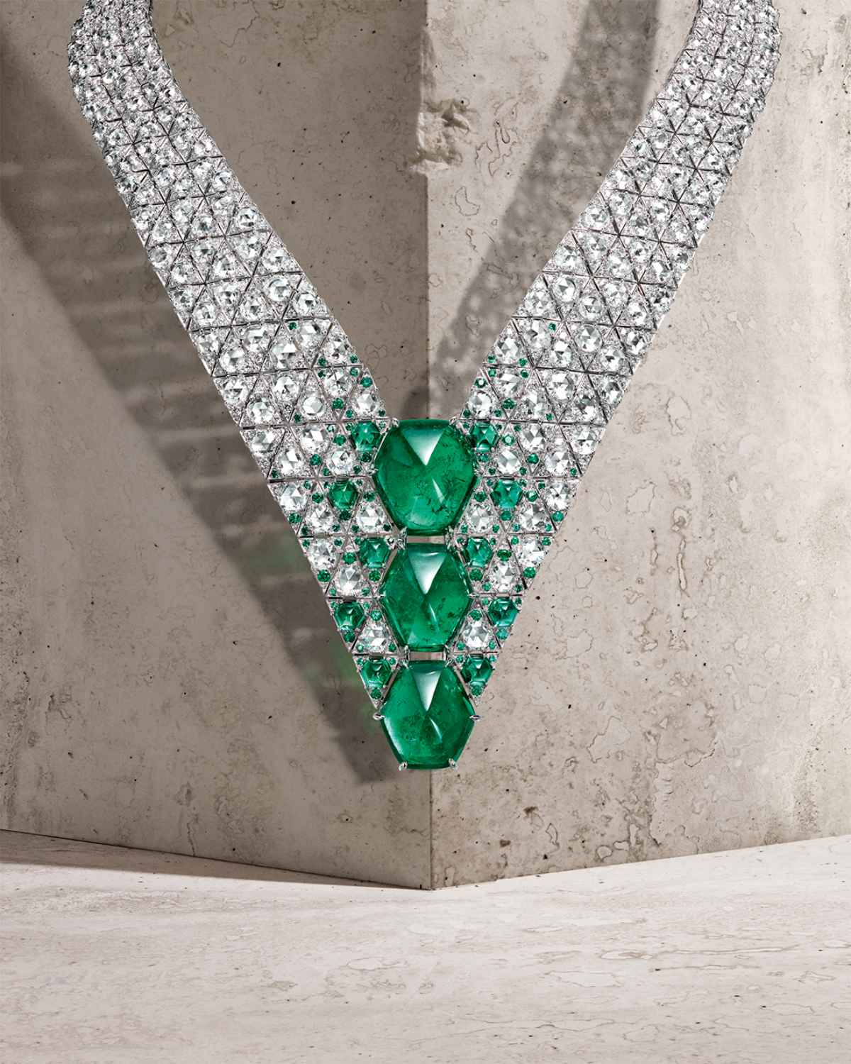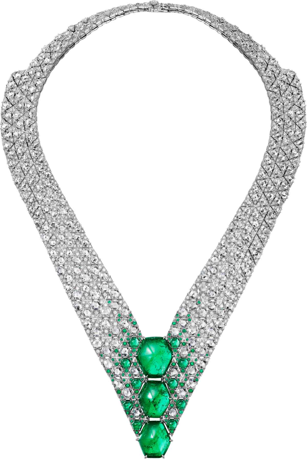 Kết cấu, kích thước, chính làn da của kỳ nhông xanh đã tạo cảm hứng cho các studio thiết kế của Maison tạo ra bộ sản phẩm này. Nó bộc lộ vẻ đẹp của nó thông qua một chiếc vòng cổ có nhiều kim cương và ngọc lục bảo.