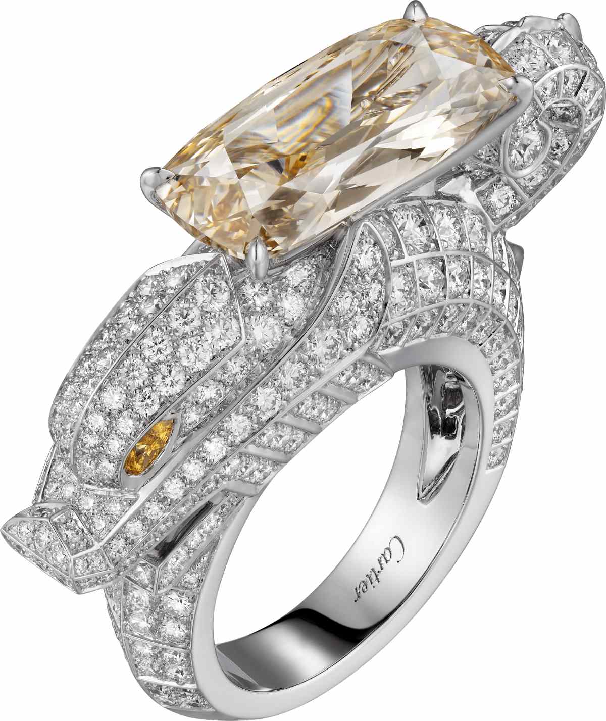 Tất cả mọi thứ đều dựa trên tính mềm mại và hình dạng tinh tế của khung cảnh, điều này gợi lên sự thay đổi và chuyển động của thuộc tính da động vật. Cartier tập trung vào kết cấu bằng cách sắp đặt yếu tố đầy đủ và trống rỗng trong sự liên tiếp của các hình tam giác lát bằng kim cương. Từ đó tạo ra một tác phẩm mở giữa các mặt khác nhau, giống như các mặt của ba viên ngọc lục bảo Colombia ngoạn mục nặng 43,45 carat. Tiêu biểu cho chuyên môn và phong cách của Cartier, vết cắt bốn cạnh của chúng được tạo hình để gợi nhớ đến những chiếc gai ở lưng của động vật.