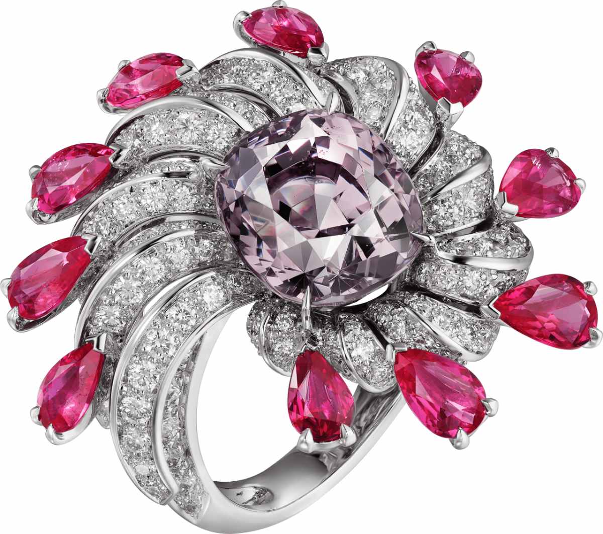 Đó là điều kỳ diệu của một loài hoa thủy sinh, vẻ đẹp mà Cartier đã thu phục. Thương hiệu đã tạo hình cách điệu trang sức dưới hình ảnh bông hoa súng. Chúng ta ngay lập tức bị thu hút bởi viên đá trung tâm là một loại rubellite 10,61 carat, xung quanh là những cánh hoa kim cương được bao quanh bởi mã não mở ra, làm tăng ấn tượng về thể tích. Tất cả chúng đều có hình dạng hình học, biểu tượng của Cartier High Jewellery.