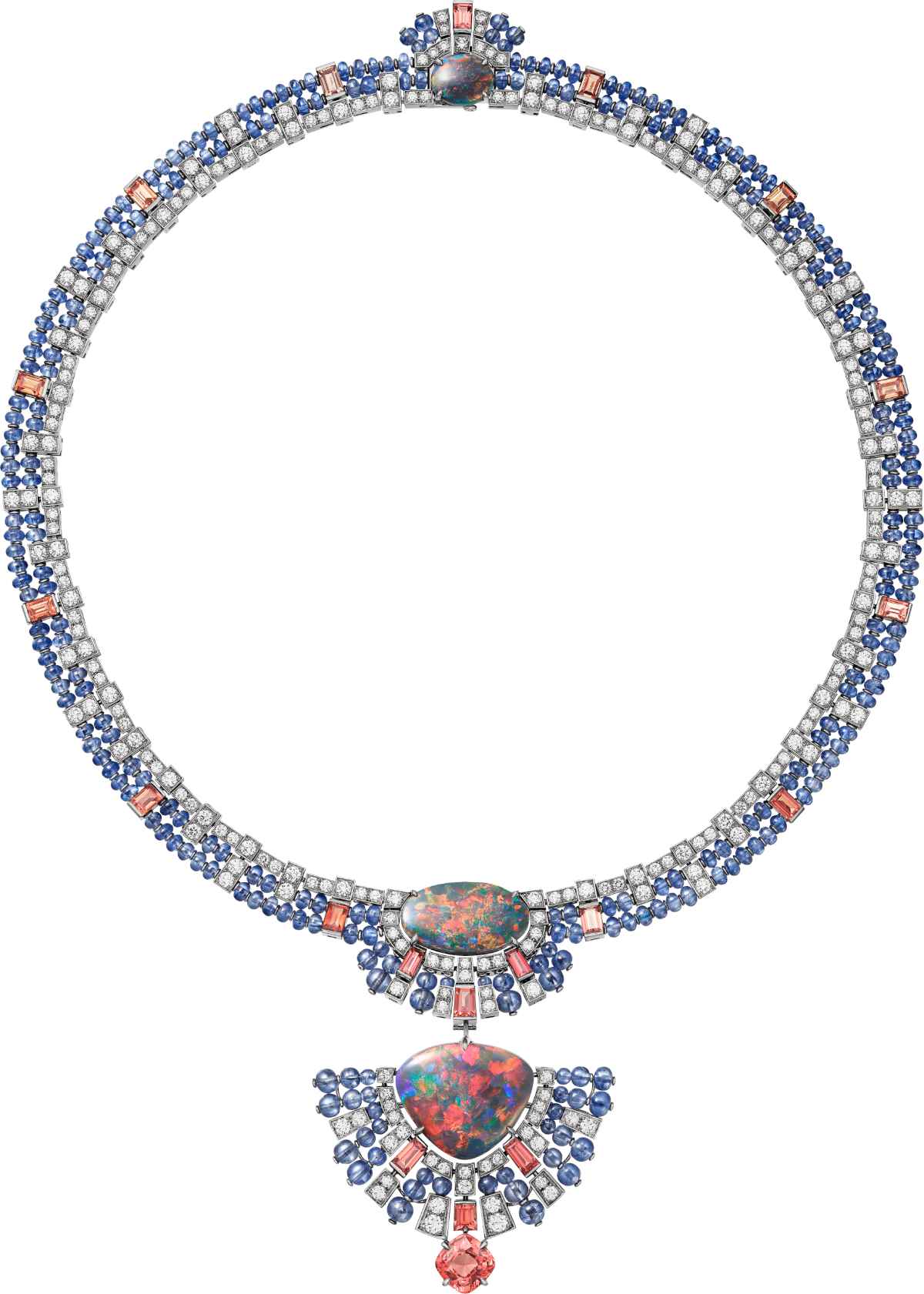 Chiếc vòng cổ Apatura được tạo ra từ nguồn cảm hứng là hình ảnh những cánh bướm dưới sự quan sát của một đứa trẻ. Sắc thái cầu vồng từ viên đá Opal tạo cho chúng vẻ đẹp sống động và rực rỡ. Trong đó, ba viên Opal của Úc nặng khoảng 22,08 carat được đóng khung bởi các họa tiết hình học bao gồm các thanh kim cương và các hạt sapphire xanh lam có màu sắc giống với ngọn lửa.