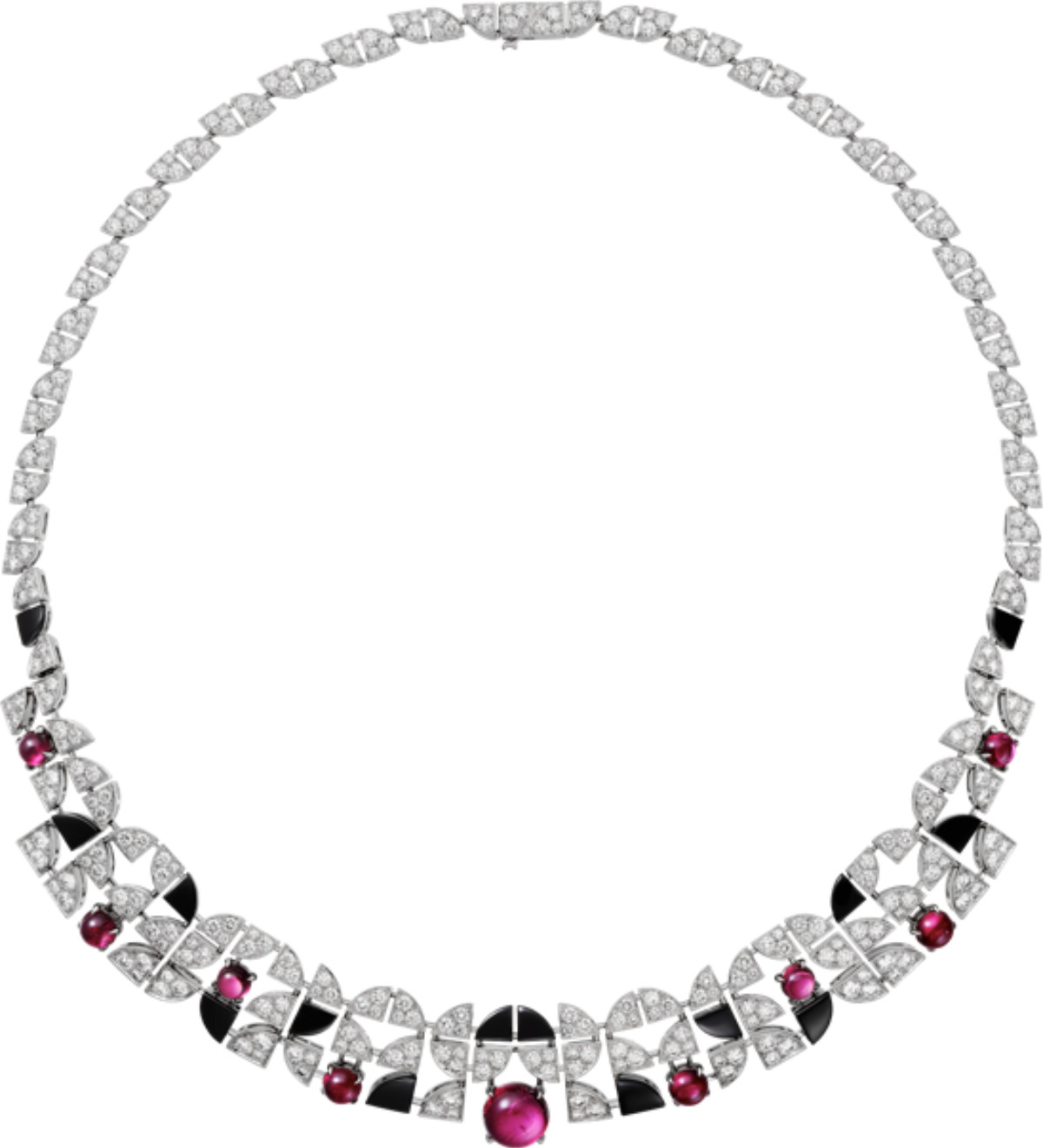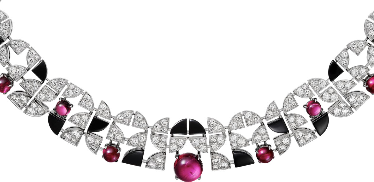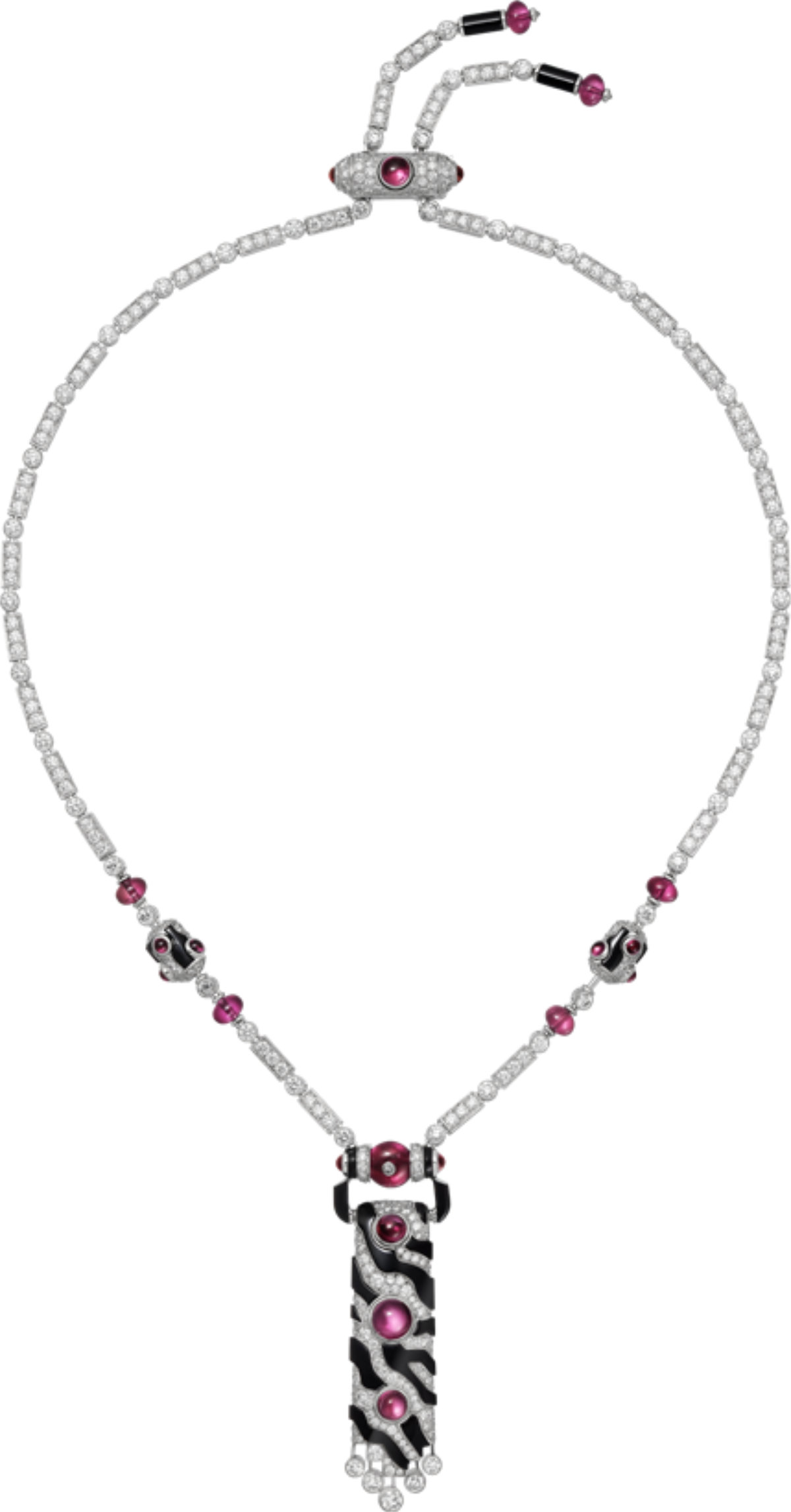 Cartier đã quan tâm đến lông thú và áo khoác trong hơn một thế kỷ. Đối với chiếc vòng cổ nguyên bản này, chính những đường sọc ngựa vằn đã tạo nên một sự cách điệu cho chính nó. Trên dây chuyền, họa tiết hoàn toàn trừu tượng, chỉ được gợi lên bằng những viên kim cương, ống mã não và dấu chấm rubellite xen kẽ. Cũng giống như các hình dạng, bảng màu của mã não và rubellite – biểu tượng cho phong cách của Cartier trong hơn một thế kỷ – cấu trúc thành phần và tạo cho nó một nhịp điệu mạnh mẽ.