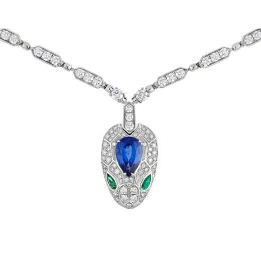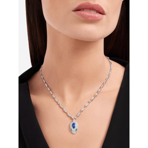 Nắm bắt sức mạnh của sự hấp dẫn, chiếc vòng cổ Serpenti tôn vinh đầu rắn trong một thiết kế trang sức lấp lánh đầy quyến rũ và tinh tế. Lấy cảm hứng từ sự gợi cảm trong ánh mắt của người phụ nữ, Bvlgari diễn giải lại con vật tinh thần của mình, tập trung vào sức mạnh từ tính của đôi mắt và truyền tải khả năng quyến rũ không thể cưỡng lại của chúng. Viên sapphire voluptuous bao quanh hình đầu rắn, là một minh chứng cho sự tinh thông của Bvlgari với các loại đá quý màu: sang trọng với một chút nguy hiểm. Vòng cổ Serpenti bằng vàng trắng 18k với sapphire xanh, ngọc lục bảo và kim cương pavé.
