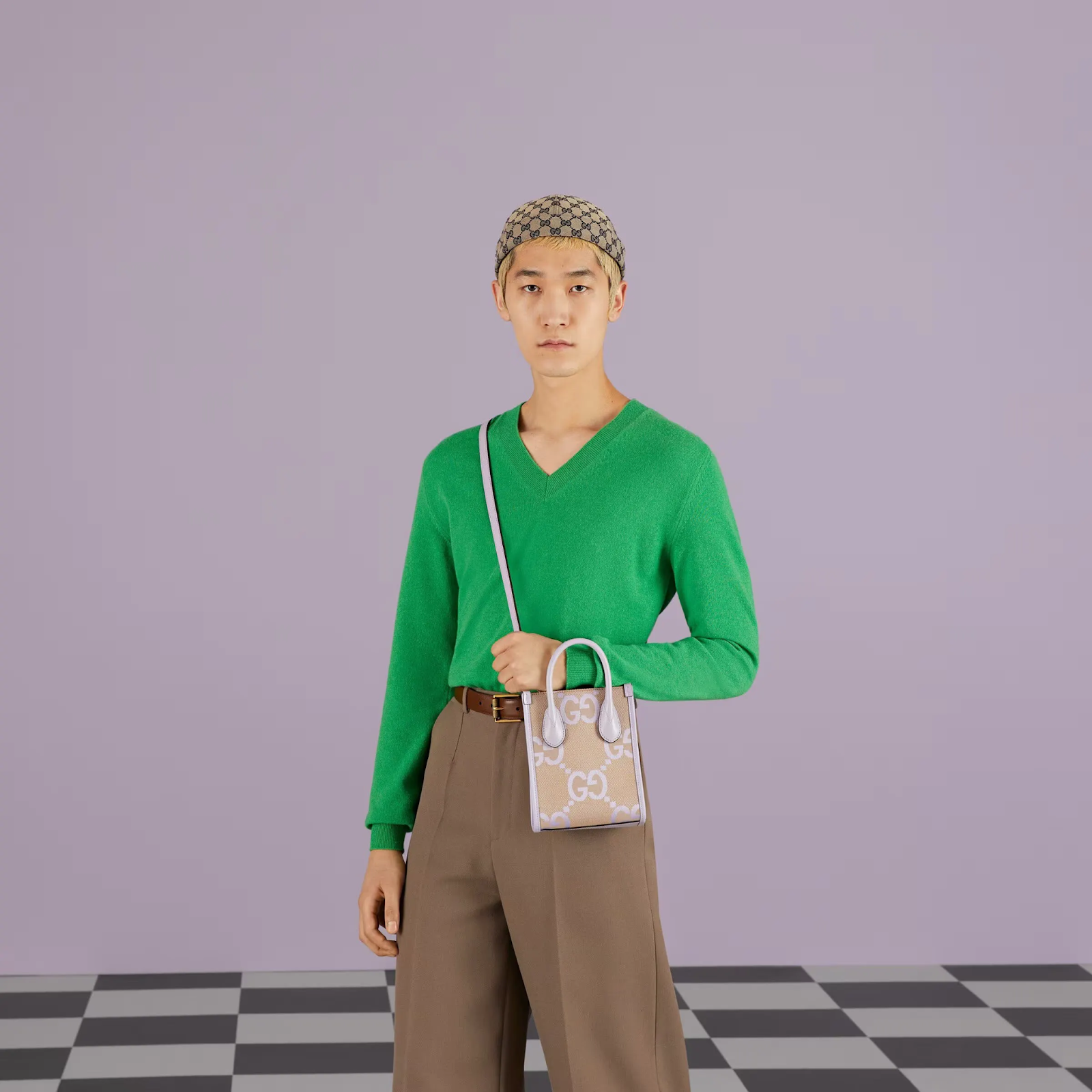 Cuối cùng là Jumbo GG Mini Tote Bag (SGD2310), kiểu dáng phù hợp với bất kì giới tính nào. Trong phiên bản sắc tím và xanh mint tươi mới, chiếc túi kết hợp khóa liên động vẫn luôn nằm trong DNA của nhà mốt kể từ khi ra mắt. Khác với các phiên bản cũ của Jumbo GG Mini Tote Bag, item này không có lớp logo bằng da trang trí ở giữa, thay vào đó, hiệu ứng logo bản lớn trở thành tâm điểm.