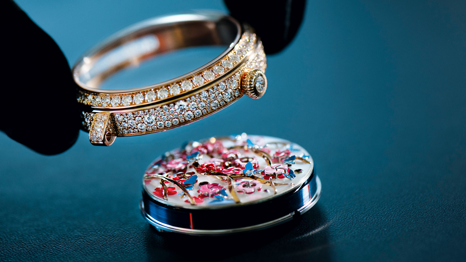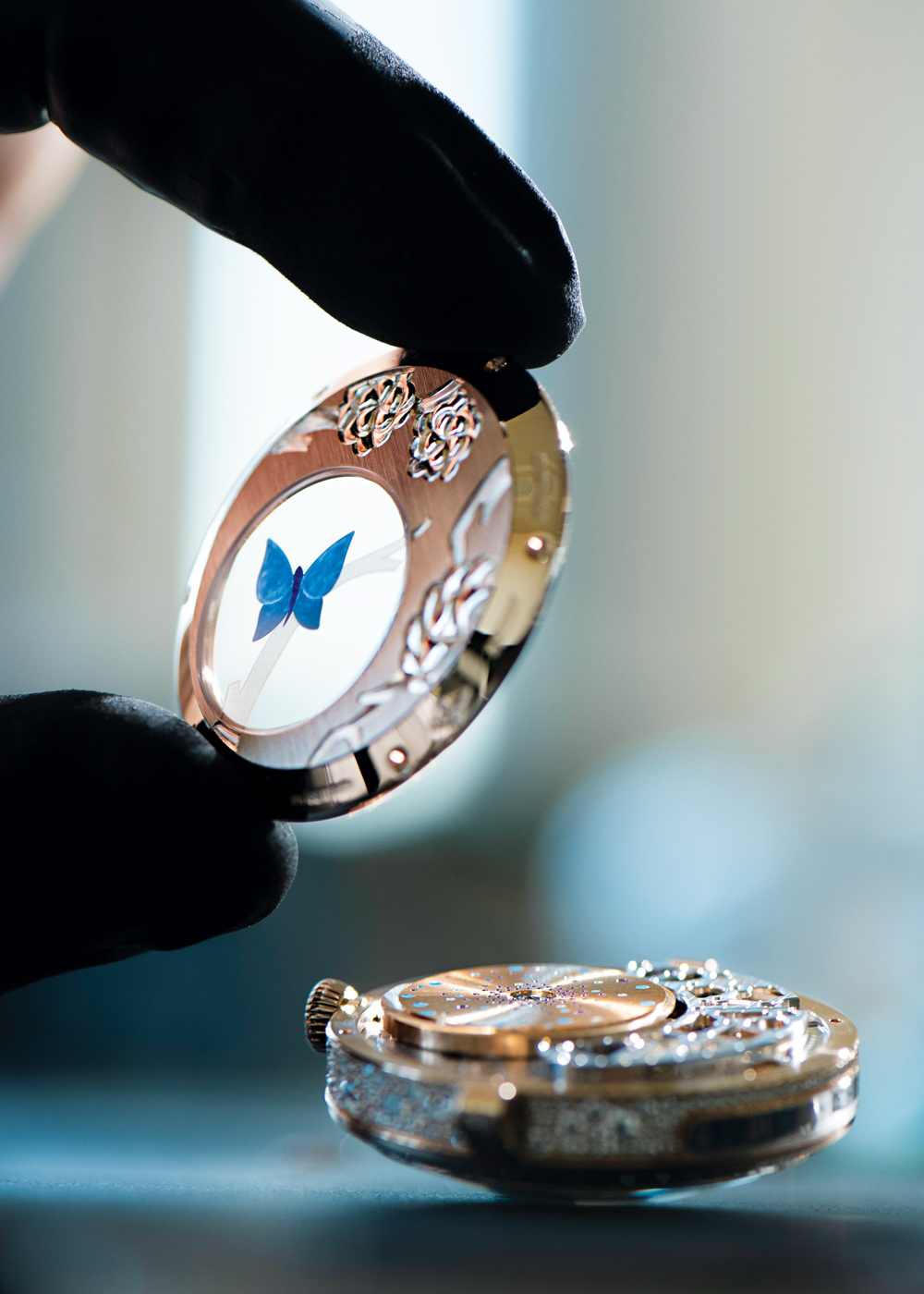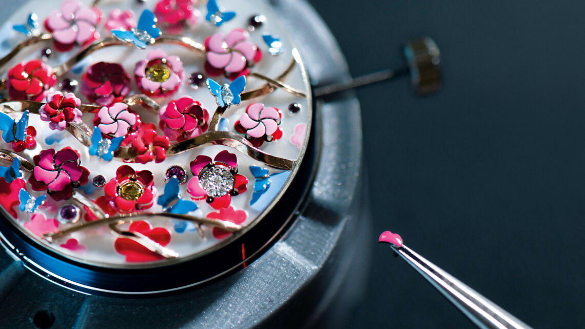 Chiếc đồng hồ trải qua mười bước hoàn thiện, bắt đầu với công đoạn cố định 533 mảng ghép với 166 chi tiết thuộc mặt số, đòi hỏi kỹ thuật công phu và độ chính xác gần như tuyệt đối. Tiếp đến, người nghệ nhân phải sử dụng nhíp để lắp đặt bánh xe mạ vang được dùng để điều chỉnh hoạt ảnh cho những bông hoa trong khu vườn. Chiếc đồng hồ có tổng cộng 13 cầu máy, bộ phận giúp cố định những bông hoa trên mặt số và đóng vai trò quan trọng đối với cơ chế đóng – mở của các cánh hoa.