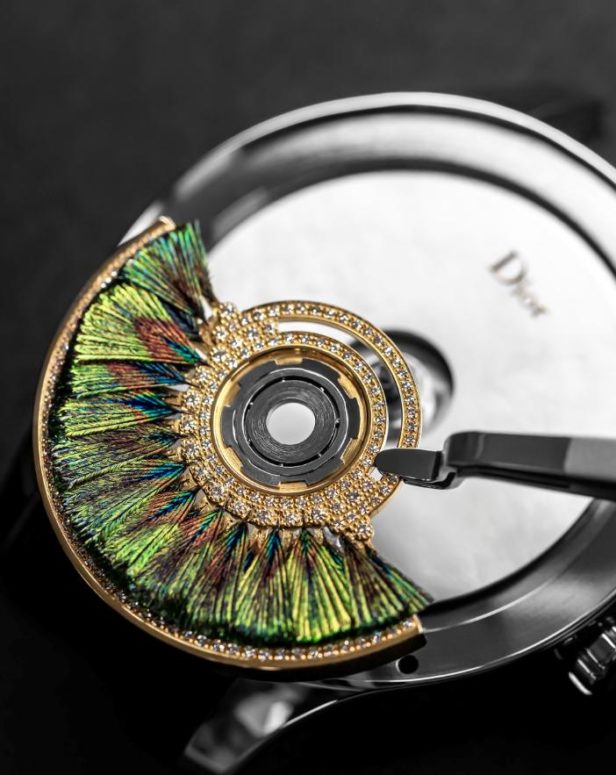 Được trang trí bằng lông vũ sặc sỡ, trọng lượng dao động của đồng hồ Dior Grand Bal Plume mới làm tăng thêm sự sống động cho mặt số xà cừ trắng ánh kim, không thể thiếu vàng và kim cương nạm trên vỏ.