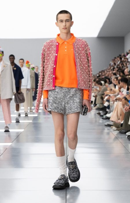Những hình bóng sắc nét được biến đổi trong thế giới của đàn ông, khi Jones tập trung sự chú ý của mình vào những bộ vest thoải mái và những chiếc áo khoác dài xếp nếp. Những món đồ trở nên trang trọng hơn khi được kết hợp với trang phục thường ngày như áo khoác trễ vai, áo len đan và quần xếp ly rộng. Dù đơn giản nhưng vẫn giữ được vẻ thanh lịch của riêng chúng, khi được chế tác bằng các kỹ thuật đặc trưng của Dior như thêu và khâu cannage phức tạp.