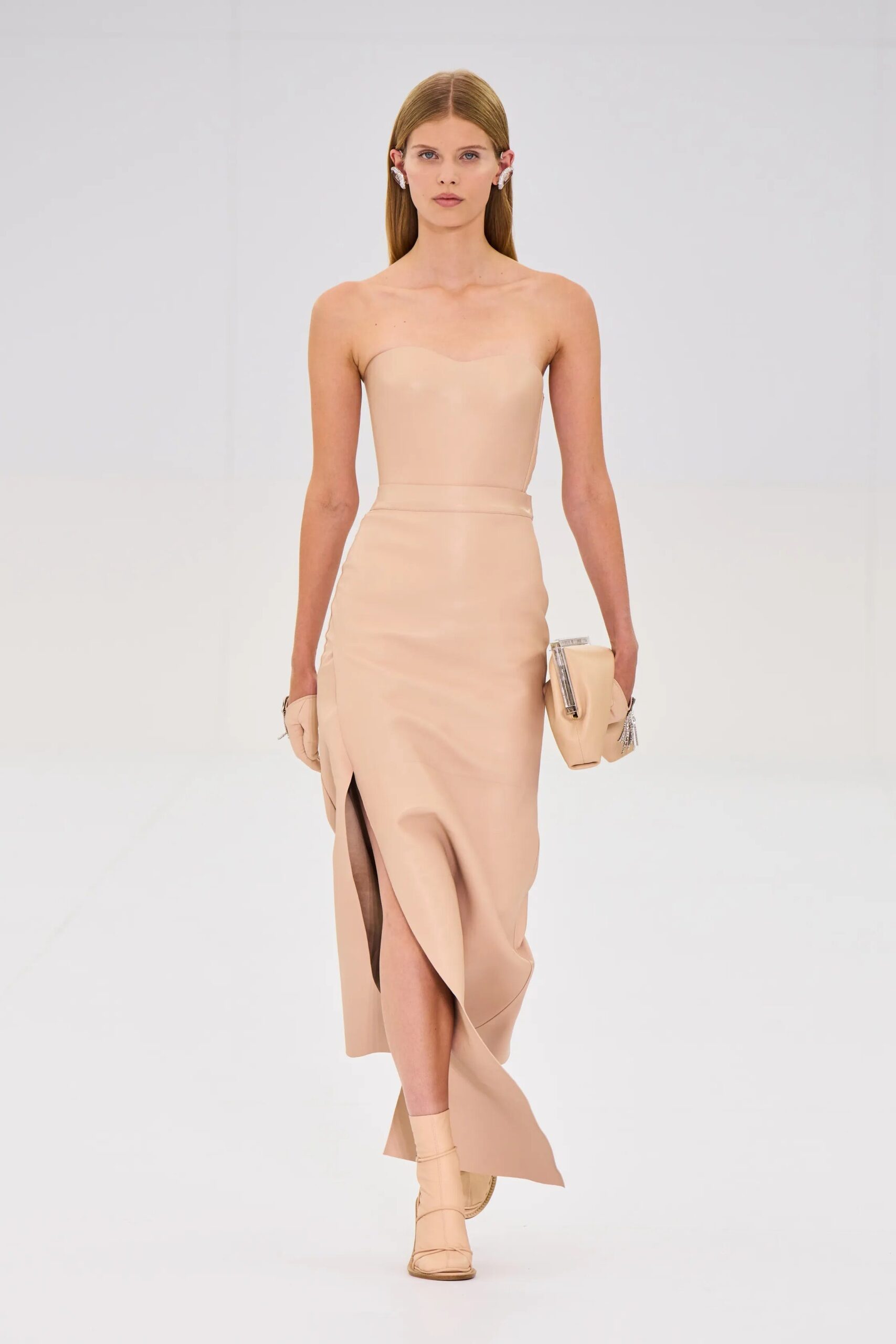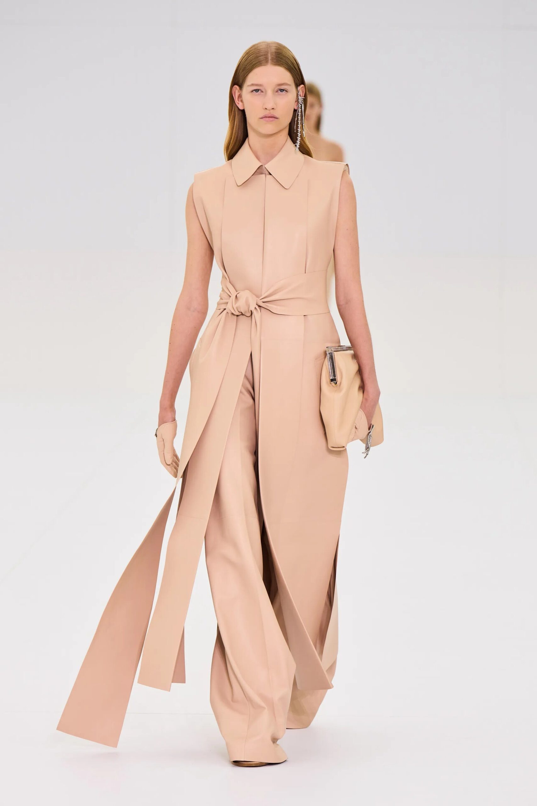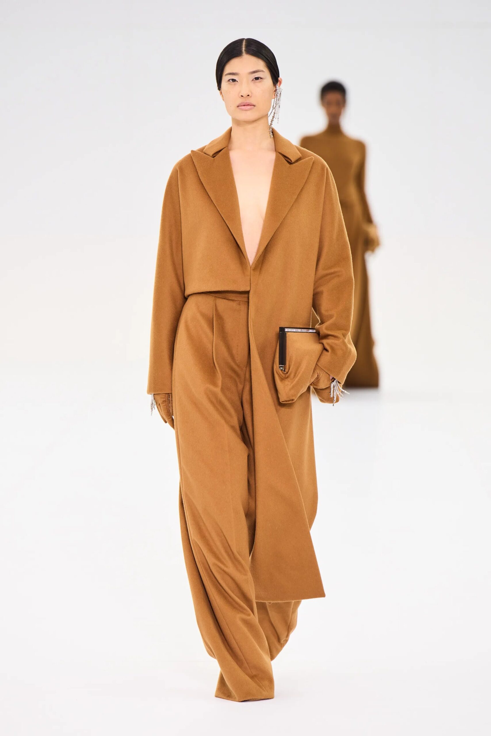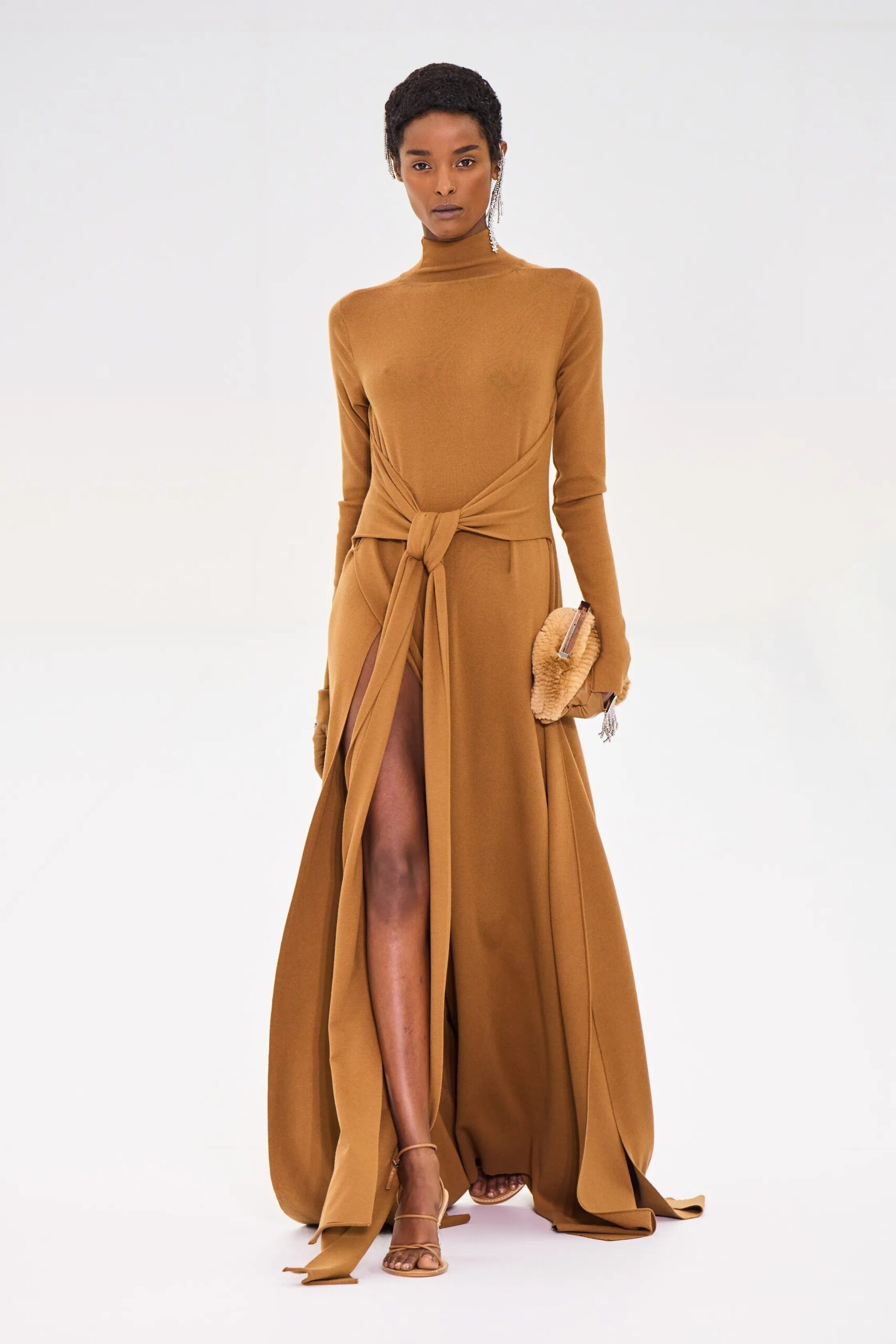 3 looks mở màn, hai bộ suits may đo và một chiếc váy len cổ lọ dài với chân váy xẻ tà và nút thắt màu nâu đặc biệt. Chỉ những người siêu giàu và những thợ dệt vải chuyên nghiệp tại Loro Piana – Ý – mới nhận ra chất liệu đặc biệt đó là Vicuna, loại vải đắt nhất thế giới, được các người dân địa phương chải với số lượng cực kỳ ít ỏi từ lông lạc đà Vicuña, được bảo vệ tại vùng núi khắc nghiệt Andes.