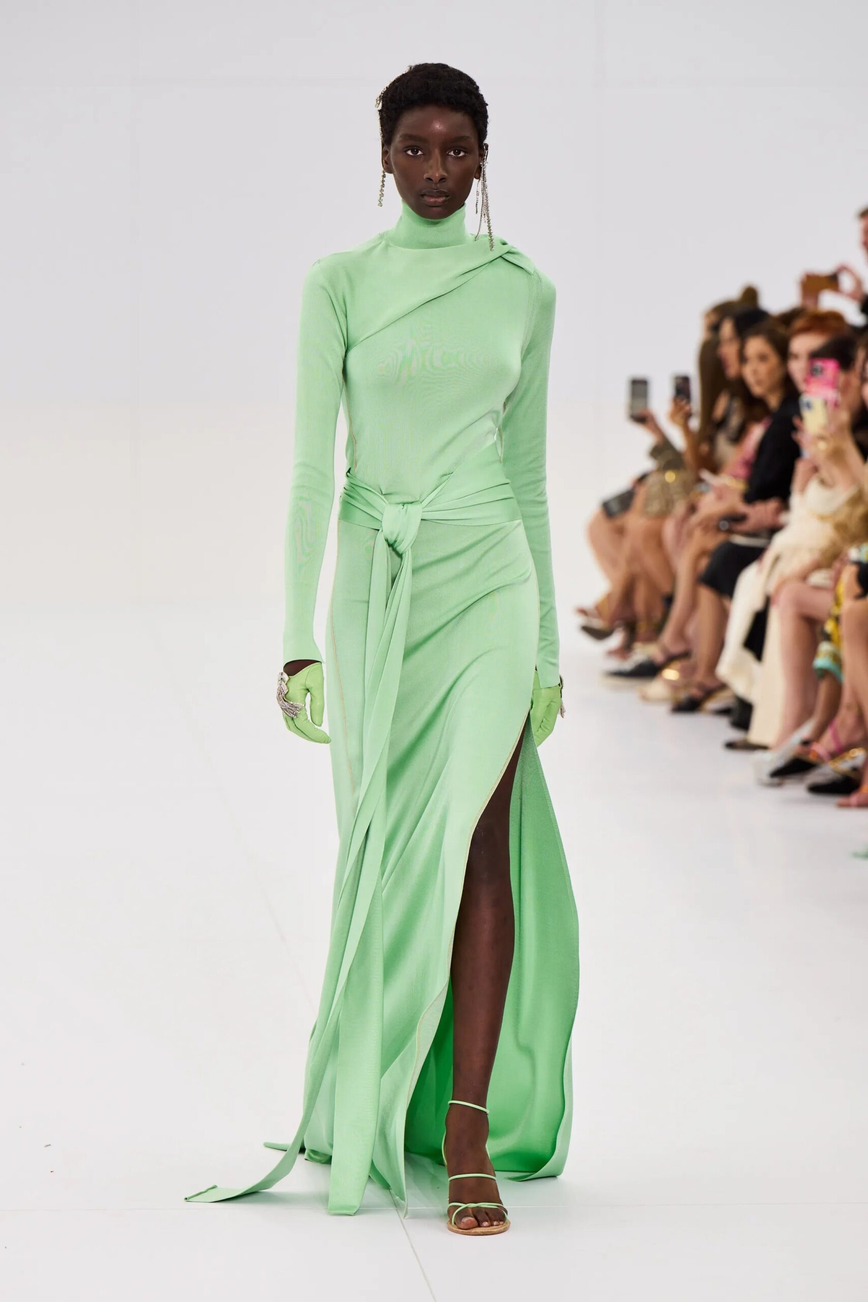 Nếu tất cả những vật liệu nghe có vẻ cổ điển và lịch sử, thì bộ sưu tập này nhất định tràn ngập tinh thần hiện đại, là sáng tạo đẹp và quyến rũ nhất của Jones dành cho Fendi cho đến nay. Ánh sáng mạnh của sàn diễn làm tăng cường độ của màu sắc, vàng rực rỡ, xanh bạc hà, và độ trong suốt của những chiếc váy ống lưới mỏng manh lấp lánh pha lê, kết hợp với một chiếc vòng cổ xếp tầng gồm hơn 1.000 viên kim cương trắng và vàng lạ mắt – bước đột phá đầu tiên của Fendi trong dòng trang sức cao cấp do Delfina thiết kế.