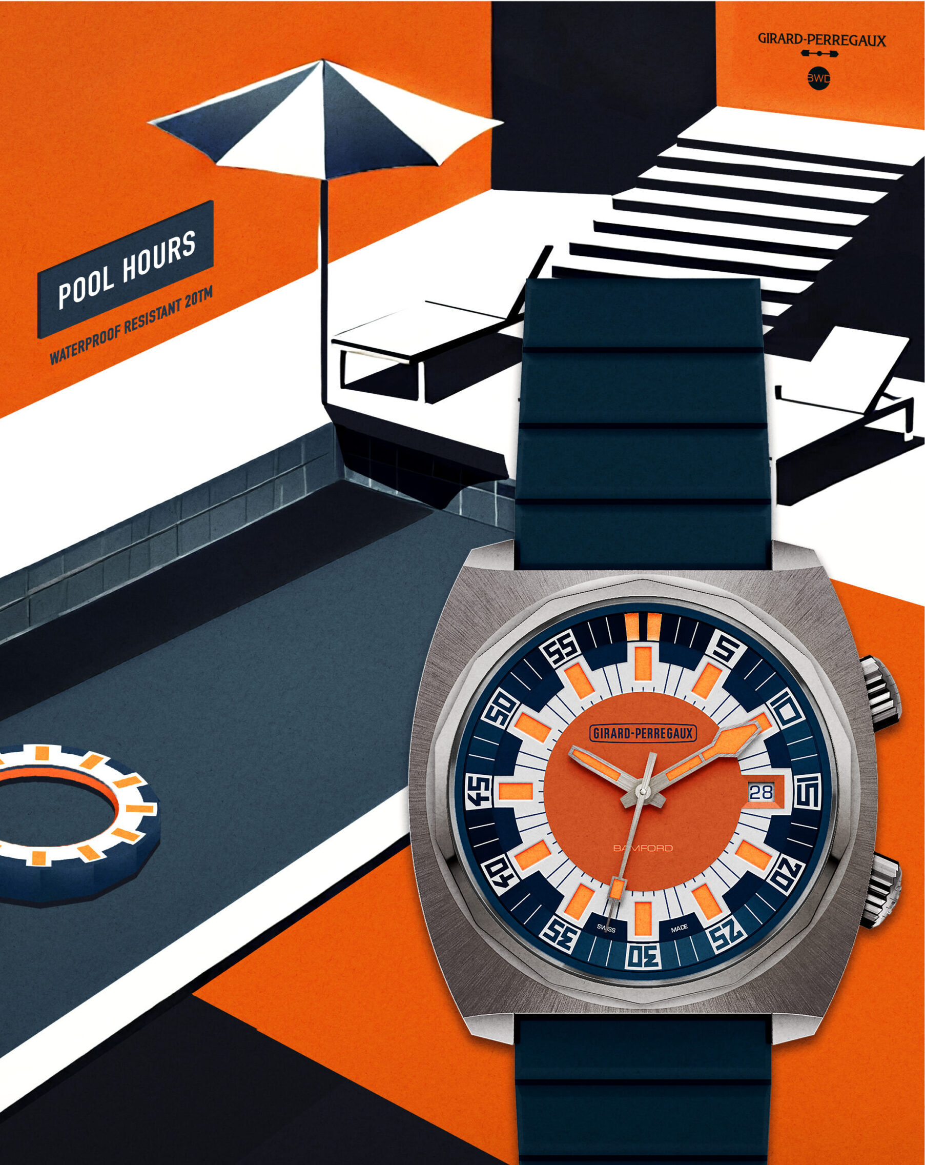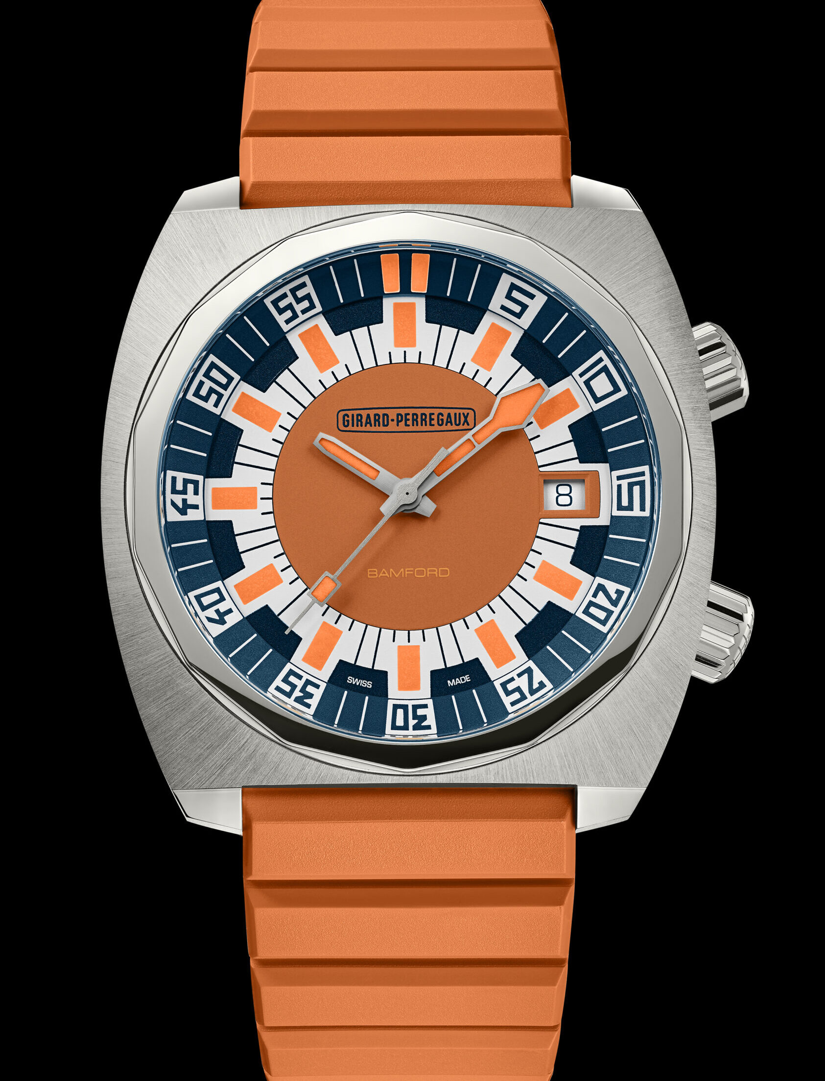 Mặt số còn được điểm xuyết logo Girard-Perregaux phong cách thập niên 60, cùng những dấu ấn đặc trưng từ Bamford – gợi nhắc đến sự giao thoa hài hòa giữa cổ điển và đương đại. Tính linh hoạt cũng là điểm nhấn đáng kể. Hệ thống tháo lắp nhanh cho phép thay đổi dây đeo dễ dàng, không cần công cụ hỗ trợ. Mỗi chiếc đồng hồ đi kèm dây cao su màu xanh và tặng thêm một dây cam – tăng khả năng biến hóa phong cách theo từng khoảnh khắc.