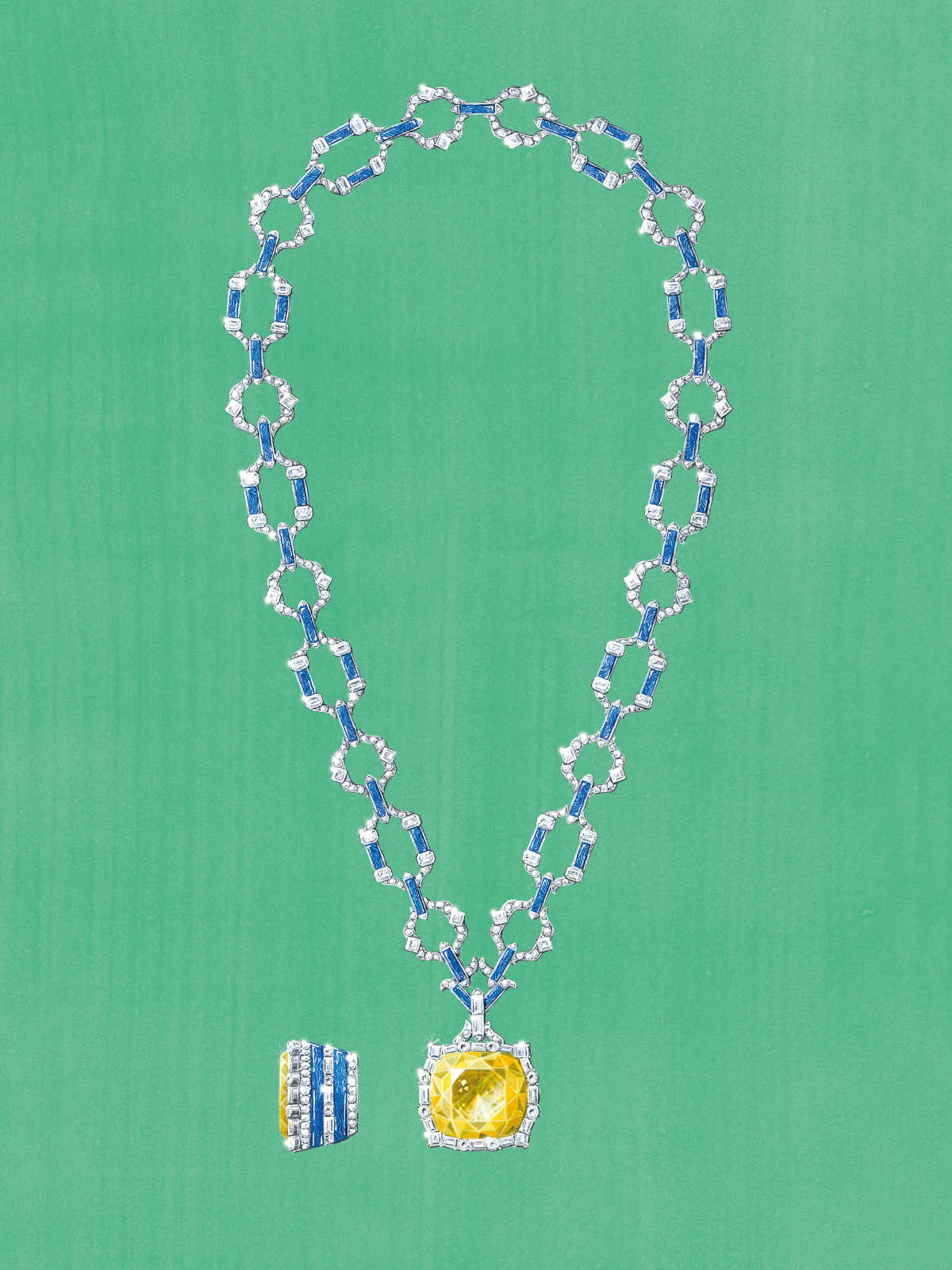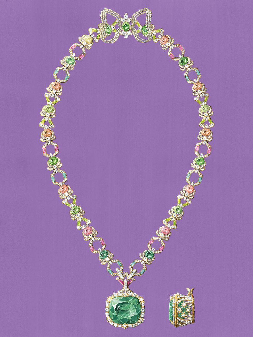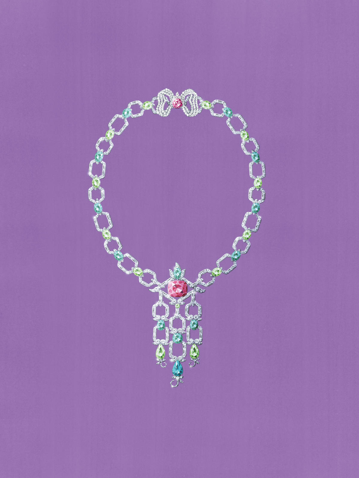BST mở đầu bằng tiết trời mùa xuân với những thiết kế độc đáo lấy cảm hứng từ sự tươi vui, nhẹ nhàng. Những gam màu đậm gợi nhớ đến những bông hoa nở rộ luôn hiện diện với chiếc vòng cổ nổi bật với đá Tourmaline xanh lá cây 226 carat tuyệt đẹp được chế tác với các họa tiết ngôi sao quanh và kim cương baguette. Cũng thu hút sự chú ý là chiếc vòng cổ với viên đá Tourmaline màu hồng 161 carat được bao quanh bởi nhiều lớp kim cương, trên cùng là dây chuyền được tô điểm bằng 72 viên đá Tourmaline 88 carat.