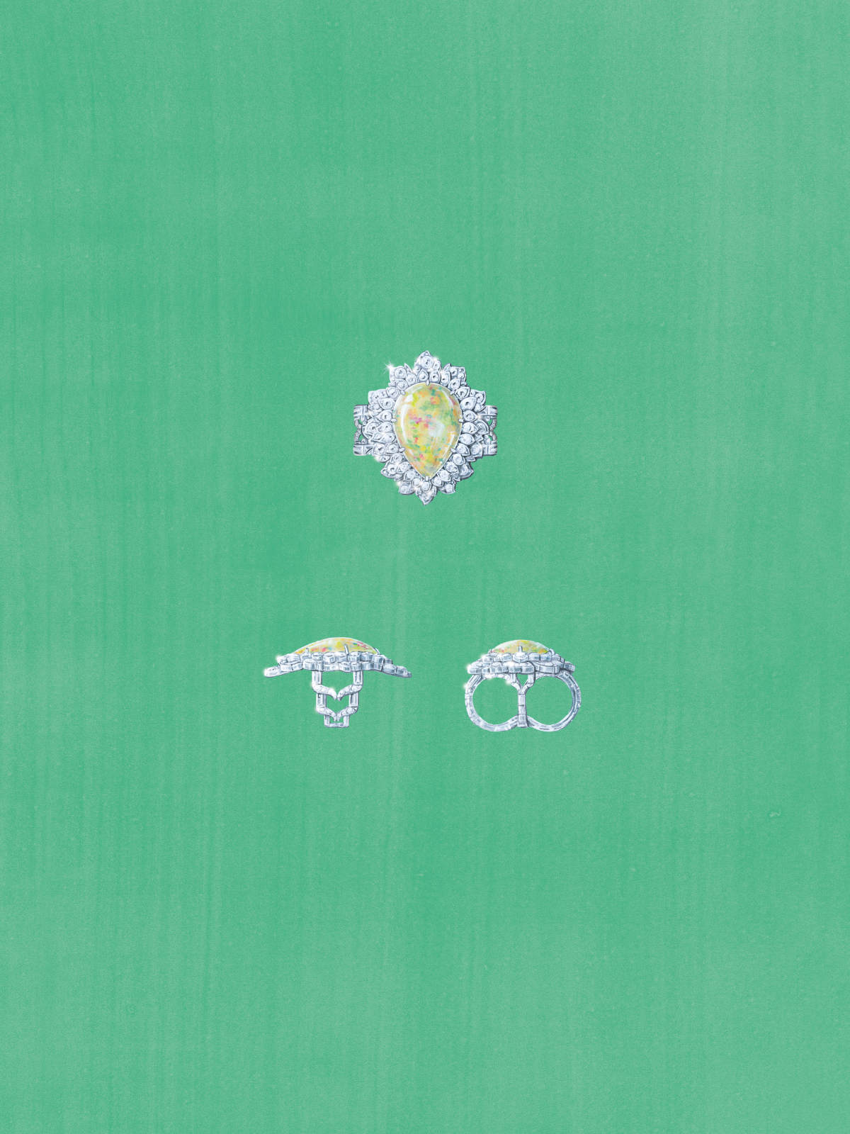 Mùa đông mang lại một chu kỳ đầy đủ hơn vì sự yên tĩnh của tuyết đối lập với năng lượng tràn đầy vui vẻ của những mùa đối lập. Đá Opal màu trắng đục và kim cương óng ánh thể hiện trọn vẹn cảm giác tinh khôi, bên cạnh những viên đá có màu kính vạn hoa tinh tế gợi ý sự trở lại của mùa xuân sau khi chu kỳ đổi mới.
