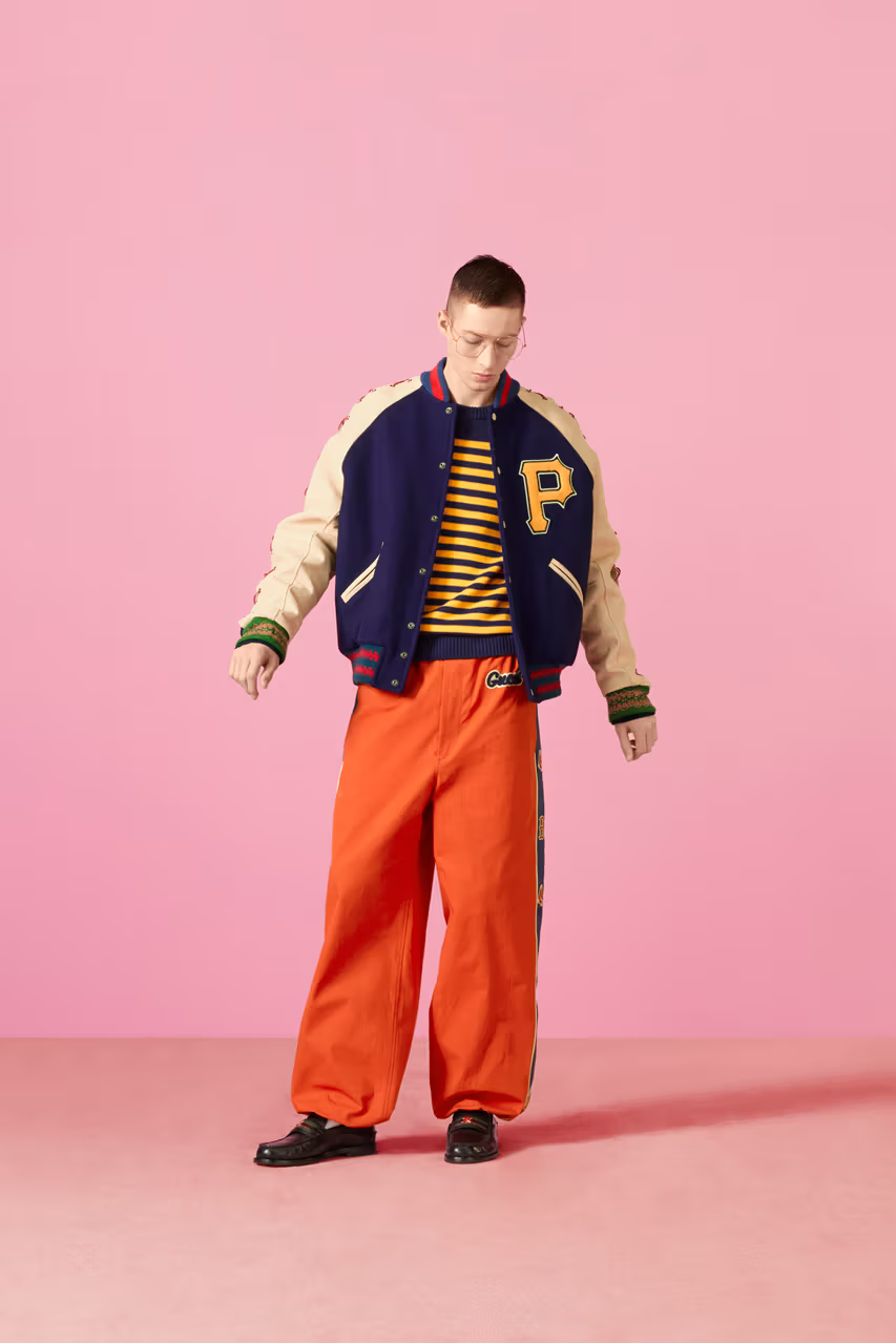 Áo khoác denim cắt ngắn, được thêu với hàng chục biểu tượng và tên đội bóng, mang đến một phong cách Gucci cho người hâm mộ MLB, cùng chiếc áo bowling với cổ áo kiểu camp được trang trí logo cùng các biểu tượng của Gucci.