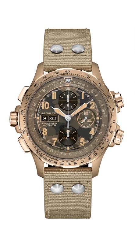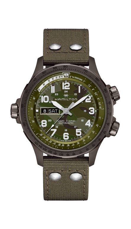 Hamilton Aviation X-Wind Automatic ra mắt dưới ba biến thể khác nhau, gồm hai mẫu Chronograph và một phiên bản Day Date. Theo đó, chiếc Day Date đi kèm mặt số camo màu xanh nhà binh đồng điệu với bộ vỏ phủ PVD đen kích cỡ 45mm. Hai chiếc Chronograph còn lại cũng sở hữu vẻ ngoài cực kỳ ấn tượng với một chiếc lắp vỏ màu nâu cổ điển cùng mặt số camo tone sur tone, chiếc còn lại mang trên mình bộ vỏ thép đánh bóng tích hợp mặt số màu xanh dương có hiệu ứng chải tia đẹp mắt. Hoàn thiện cho diện mạo đậm cá tính, gai góc của tạo phẩm là dây vải dệt trùng màu với mặt số.