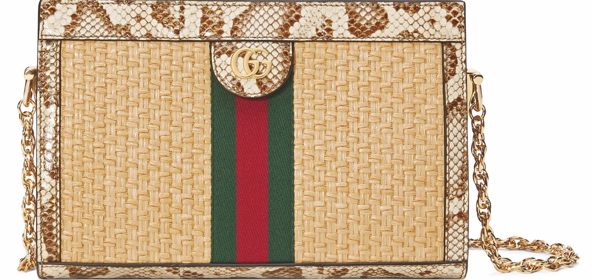 Mẫu túi xách mới nhất Ophidia được chế tạo từ vải rơm nhẹ, điều đó tạo nên một sự hòa phối ăn ý với chiếc mũ rơm trong những chuyến đi biển đầy nắng và năng động.