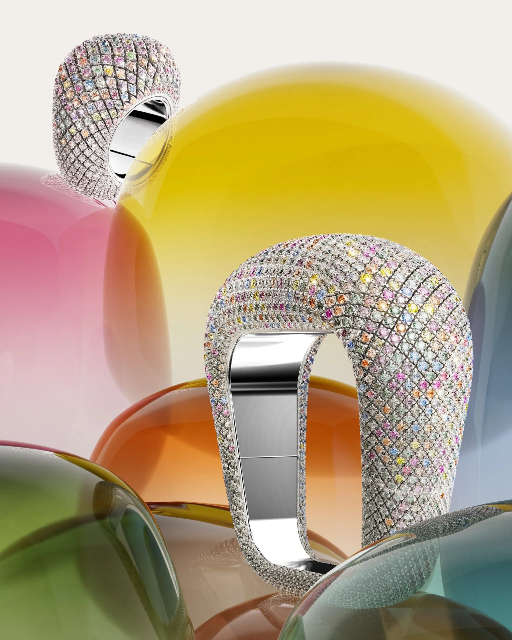 Vượt qua ranh giới của ngôn ngữ thiết kế Cartier, một chiếc vòng tay được chế tác từ những họa tiết hình học, bị phá vỡ bởi sự xâm nhập hữu cơ của những hạt vàng. Sự tương phản này tạo ra diện mạo quyến rũ về màu sắc, kết cấu của thiết kế, thể hiện tinh thần chủ đạo của bộ sưu tập. Nó nổi bật trong một chiếc đồng hồ có khớp nối, trong đó một nửa có họa tiết vàng kết cấu cổ điển, trong khi nửa còn lại bùng nổ với những hạt bong bóng nhỏ của đá opal xanh và trắng, rubellite, chalcedony xanh và tanzanite.