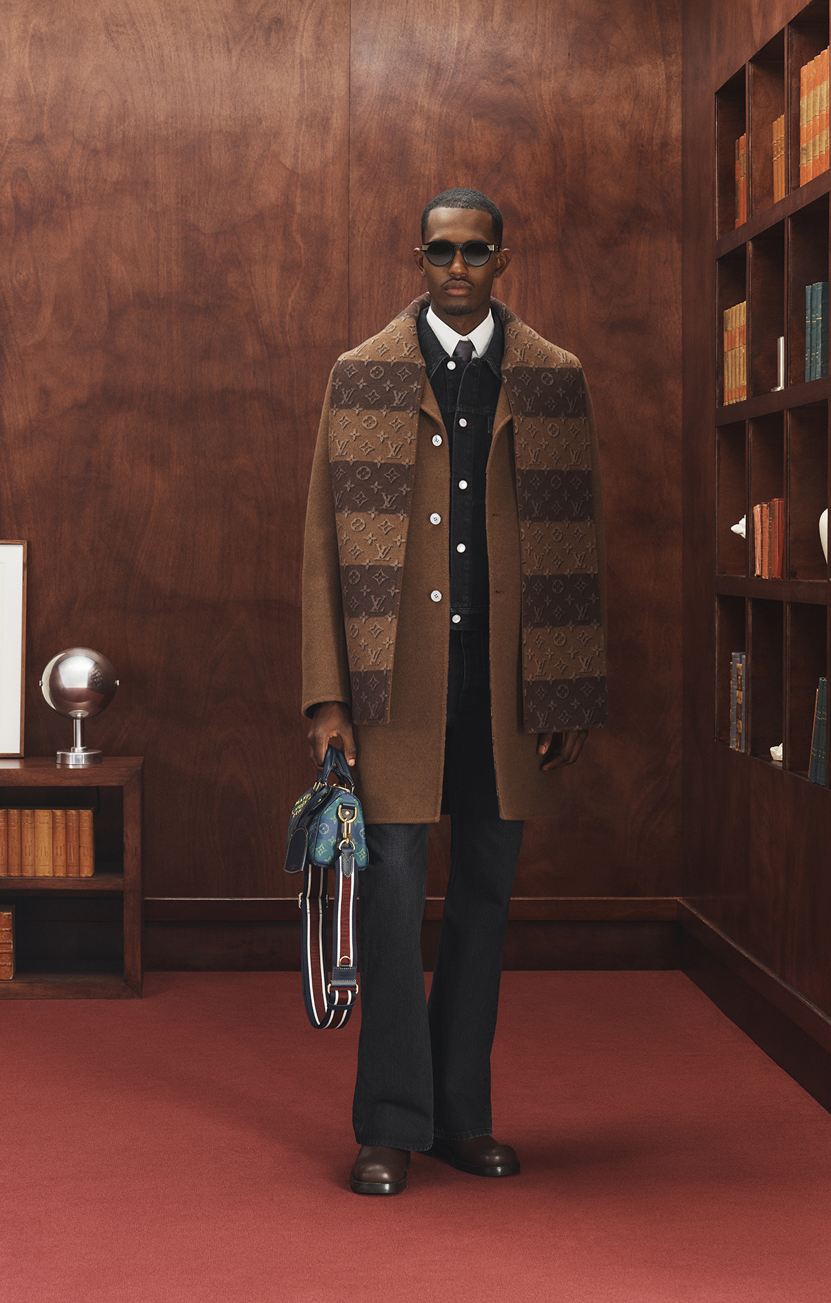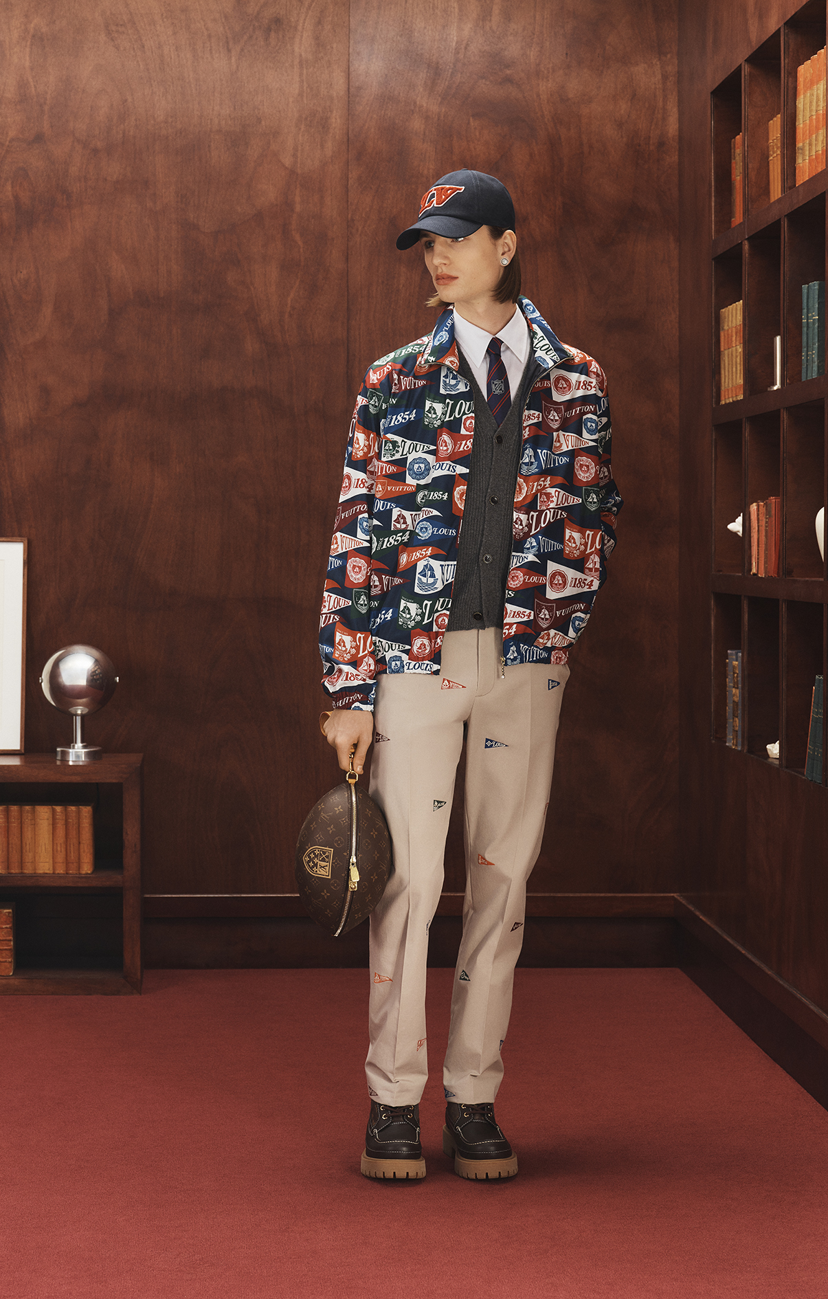 Tính xuyên mùa của BST mang đến những lựa chọn áo khoác (outerwear) đa dạng, như: áo khoác workwear xanh navy bằng len double-face, cashmere và lụa có thể đảo mặt thành sọc Monogram Heritage; áo chần bông Monogram vừa có thể mặc riêng vừa phối trong; áo khoác bouclette xanh navy một hàng khuy gợi vẻ trang trọng; áo camel jacquard double-face với khăn Monogram tháo rời lại toát lên sự thư thái. Áo khoác varsity da xanh navy mang tinh thần chuyển mùa. Knitwear gauge-7 phù hợp khí hậu thành thị, đi cùng áo jersey thêu nổi hiệu ứng len dòng chữ Marque Louis Vuitton Déposée. Quần cargo và short gợi cảm hứng workwear, cân bằng nét preppy tinh tế, kết hợp cùng track top pha chất liệu và áo khoác trucker chỉn chu.
