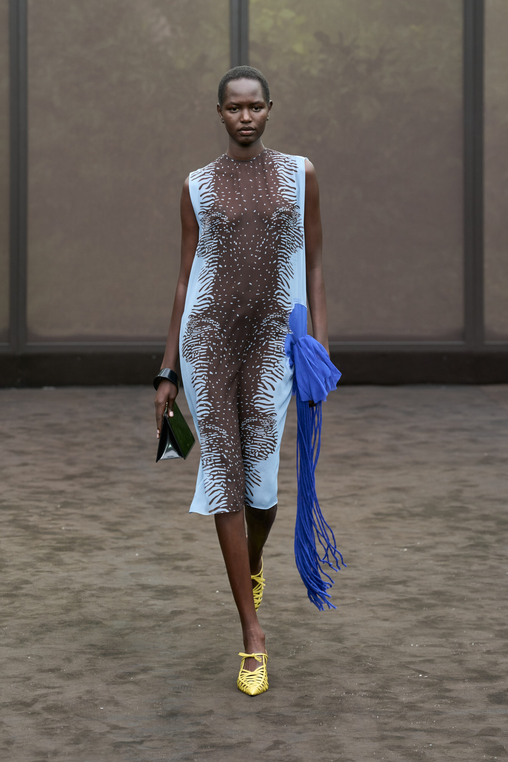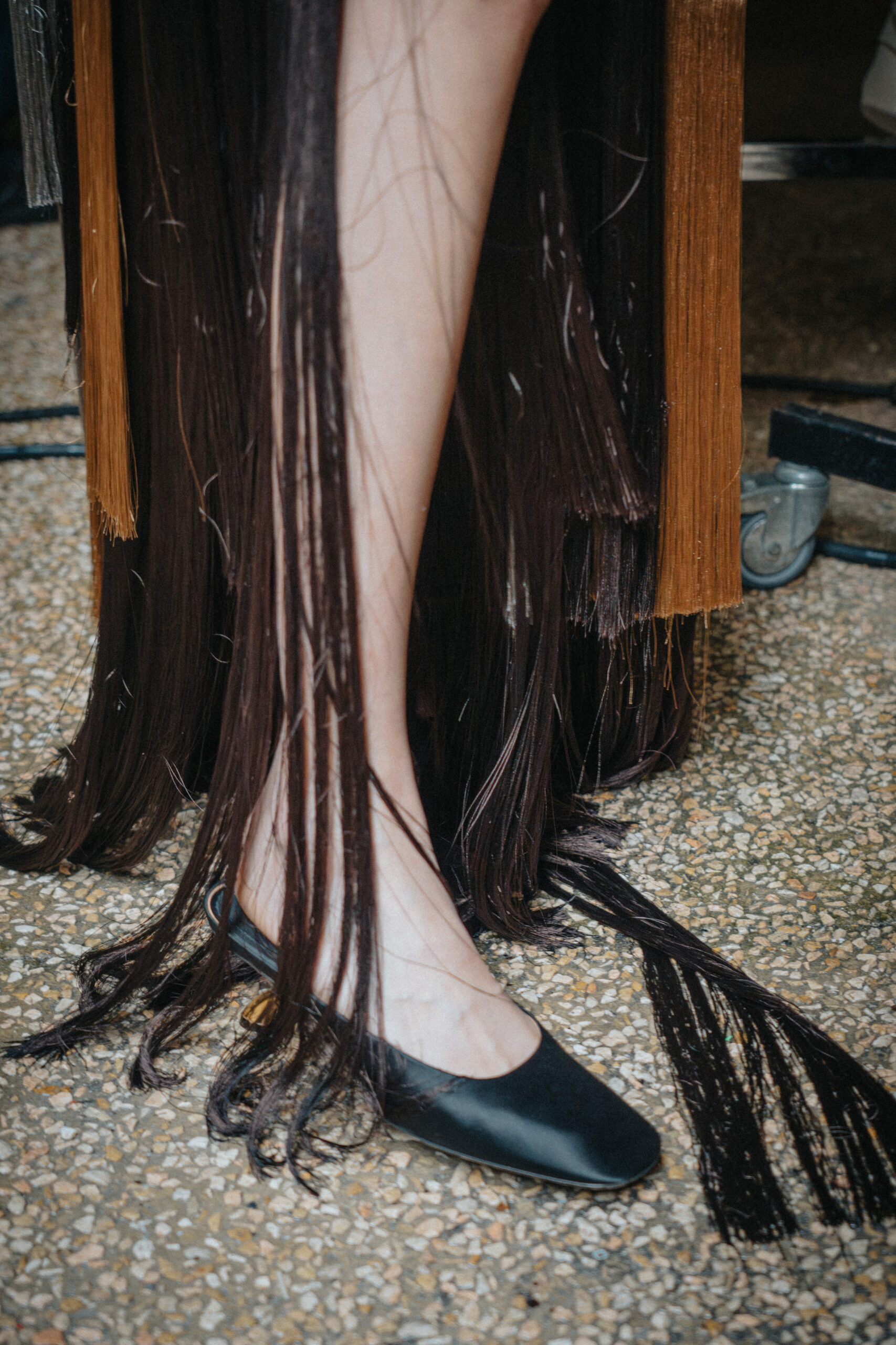 Từ kho lưu trữ hình ảnh cũ của Ferragamo, hình ảnh năm 1925 của ngôi sao màn bạc câm Lola Todd trong bộ trang phục toàn bộ họa tiết báo đã khơi gợi cảm hứng cho việc khám phá các họa tiết và chất liệu đặc trưng của phong trào “Africana” trong thời kỳ nhạc jazz. “Tôi quan tâm đến cách những chất liệu, họa tiết và vải vóc từ châu Phi và vùng Caribe được đưa vào Mỹ và châu Âu, trở thành biểu tượng của địa vị xã hội,” Davis chia sẻ – và giờ đây, tinh thần đó được tái hiện trong những thiết kế lụa satin devoré (kết hợp giữa chất liệu satin và kỹ thuật devoré) in động vật, trang sức da plongé (da cừu hoặc da bê mỏng và mềm được nhuộm xuyên thấu để giữ lại độ tự nhiên), cùng chi tiết tua rua. Thời kỳ “Roaring Twenties” đã được tái hiện qua BST này.