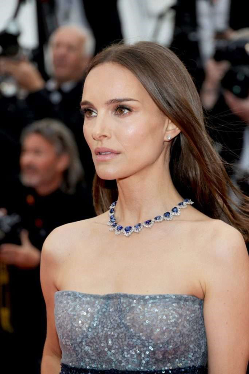 Nữ diễn viên người Mĩ lựa chọn thiết kế vòng cổ từ bộ sưu tập Red Carpet Collection của Chopard, được chế tác từ vàng trắng 18k kết hợp với các viên đá sapphire nặng tổng 119 carat và kim cương trắng. Đôi khuyên tai có cùng chất liệu tạo nên sự đồng nhất tinh tế cho Portman trên thảm đỏ.