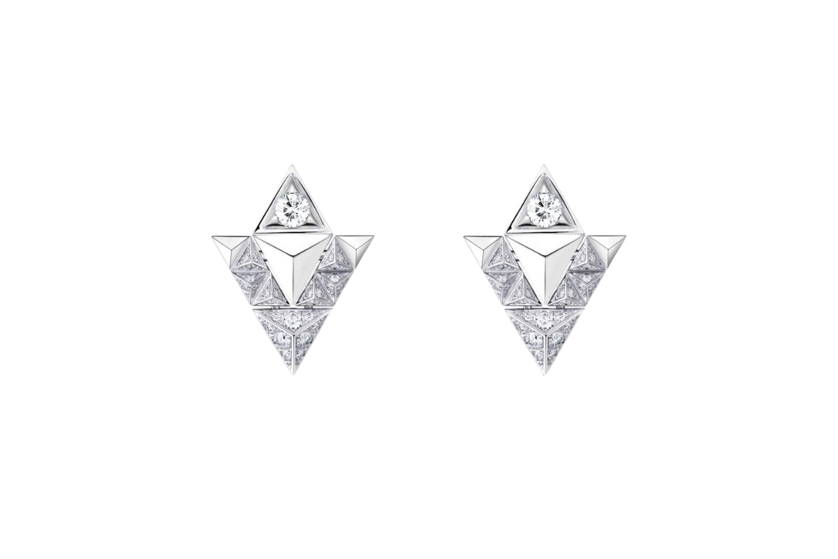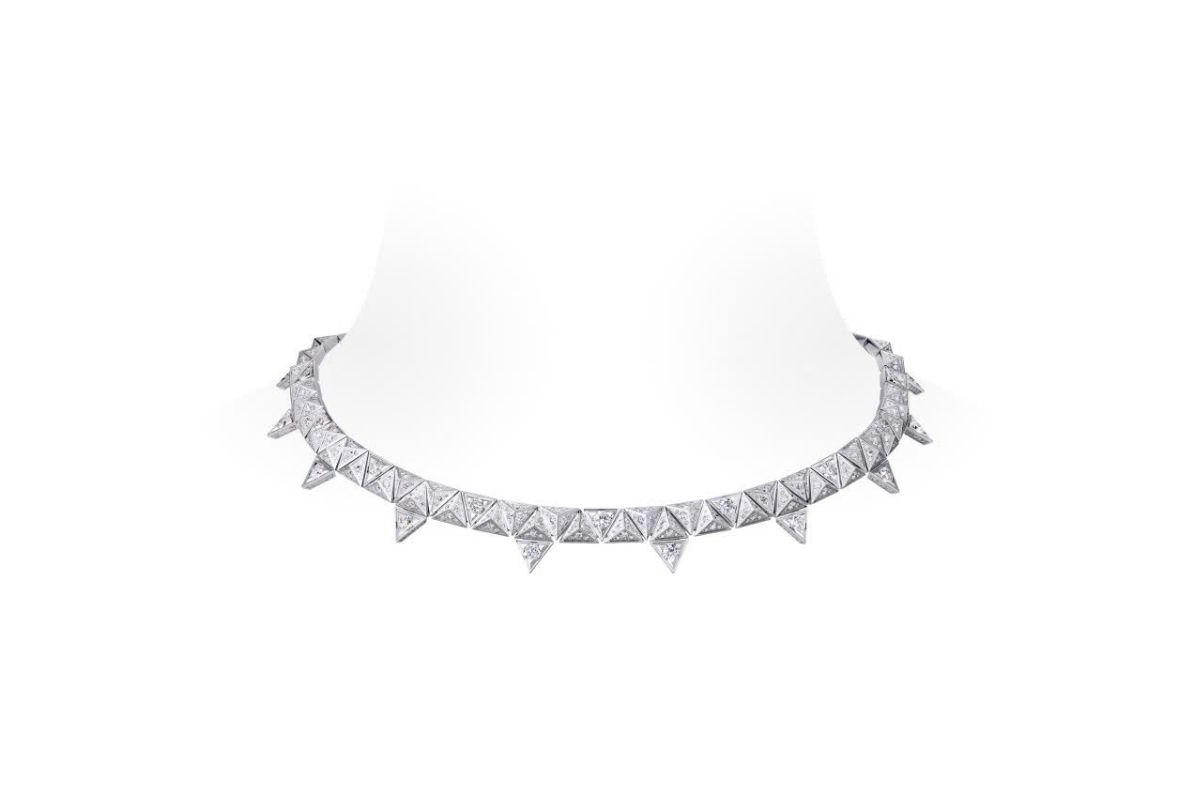 Được kiến tạo từ sự chồng lớp tinh tế của đường nét, hình khối tam giác và khối kim tự tháp, cấu trúc trang sức tinh xảo này mang đến cho vòng cổ và vòng tay một vẻ đẹp uyển chuyển đáng kinh ngạc, là kết quả của nghệ thuật chế tác tỉ mỉ đến từng khớp nối.
