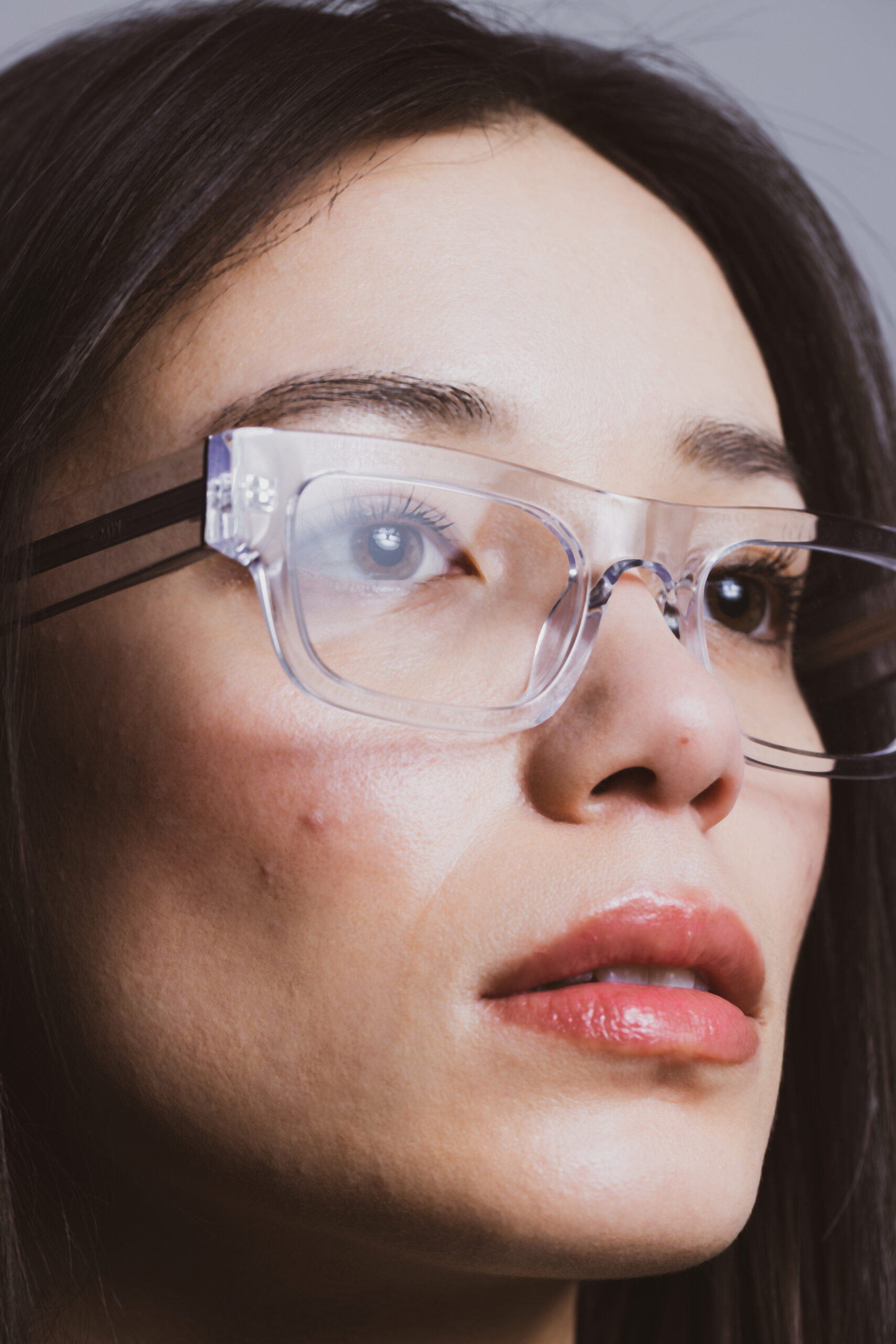 Những chiếc kính với phần viền khung mỏng mang chất liệu trong suốt sẽ là trợ thủ đánh tan cảm giác gương mặt bị tối và bí bách.