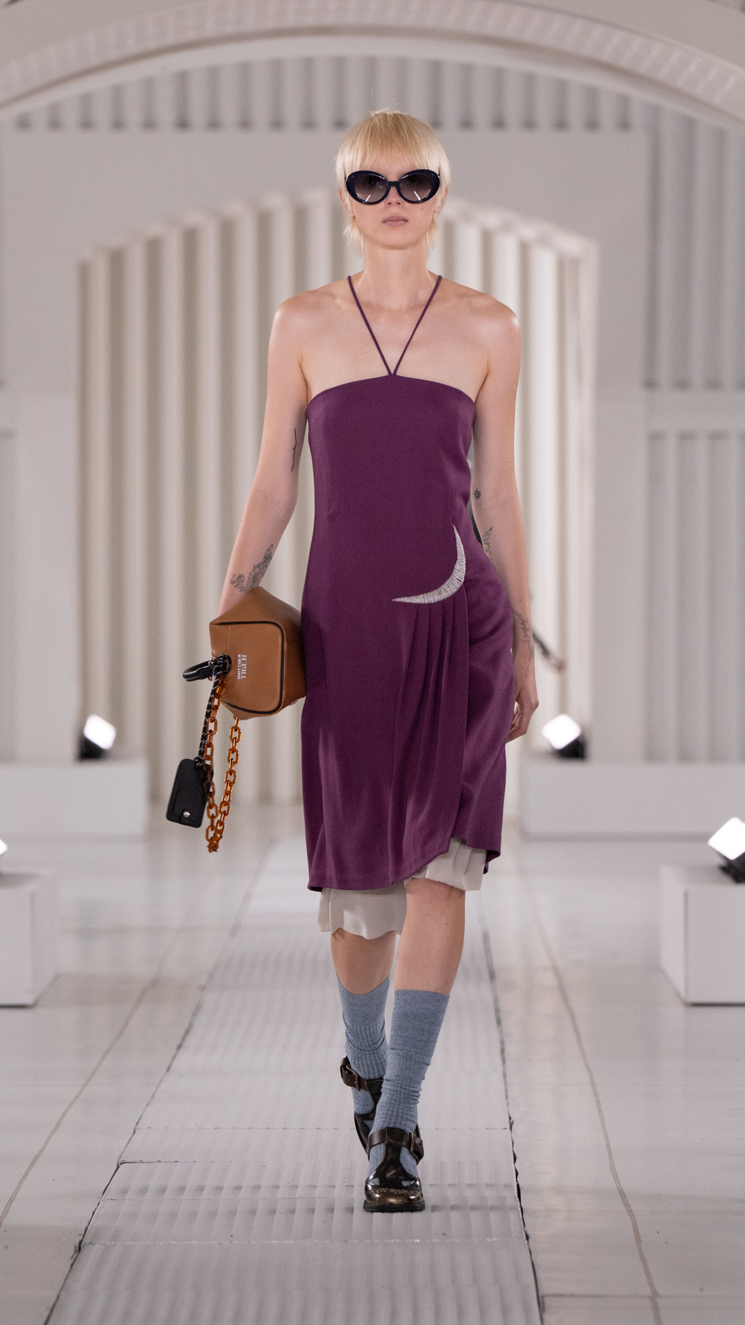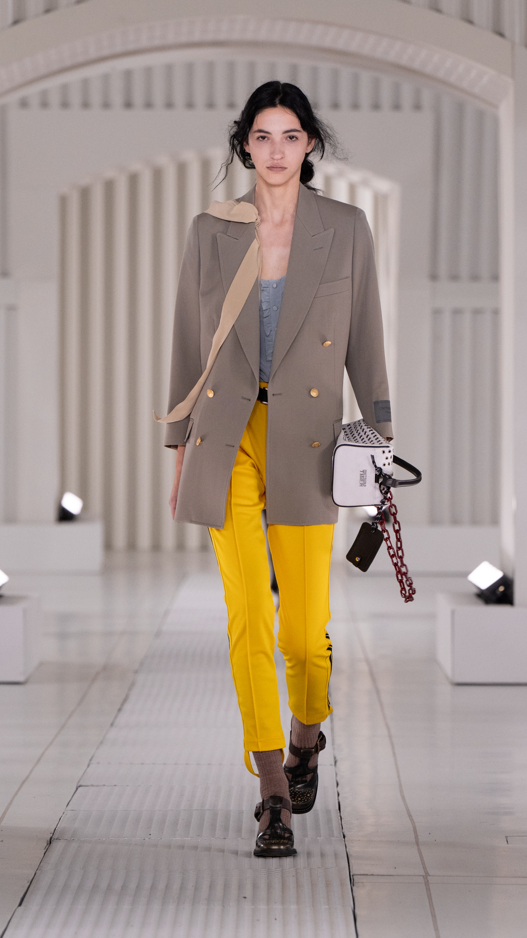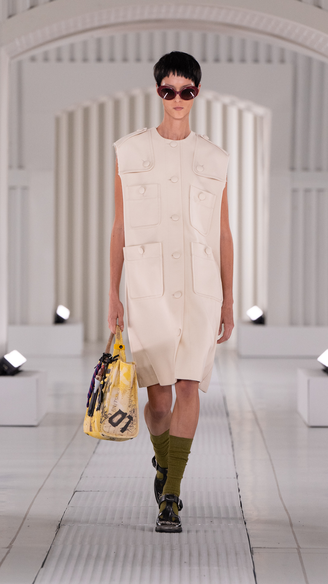 Những chiếc áo sơ mi, áo blouse và đầm với chất liệu vải nhăn mang đến cảm giác cổ điển, song hành là các thiết kế đầm lấy cảm hứng từ bodysuit được phối lớp ngẫu hứng với quần culottes phom rộng để tạo nên sự bất đối xứng đầy phá cách. Trong khi đó, chất liệu vải đứng phom được ứng dụng linh hoạt: từ những chiếc áo Parka kết hợp cùng ba lỗ dệt kim sọc và quần short, cho đến áo khoác Trucker dáng lửng với đường cắt sắc sảo và phần eo nhún bèo.