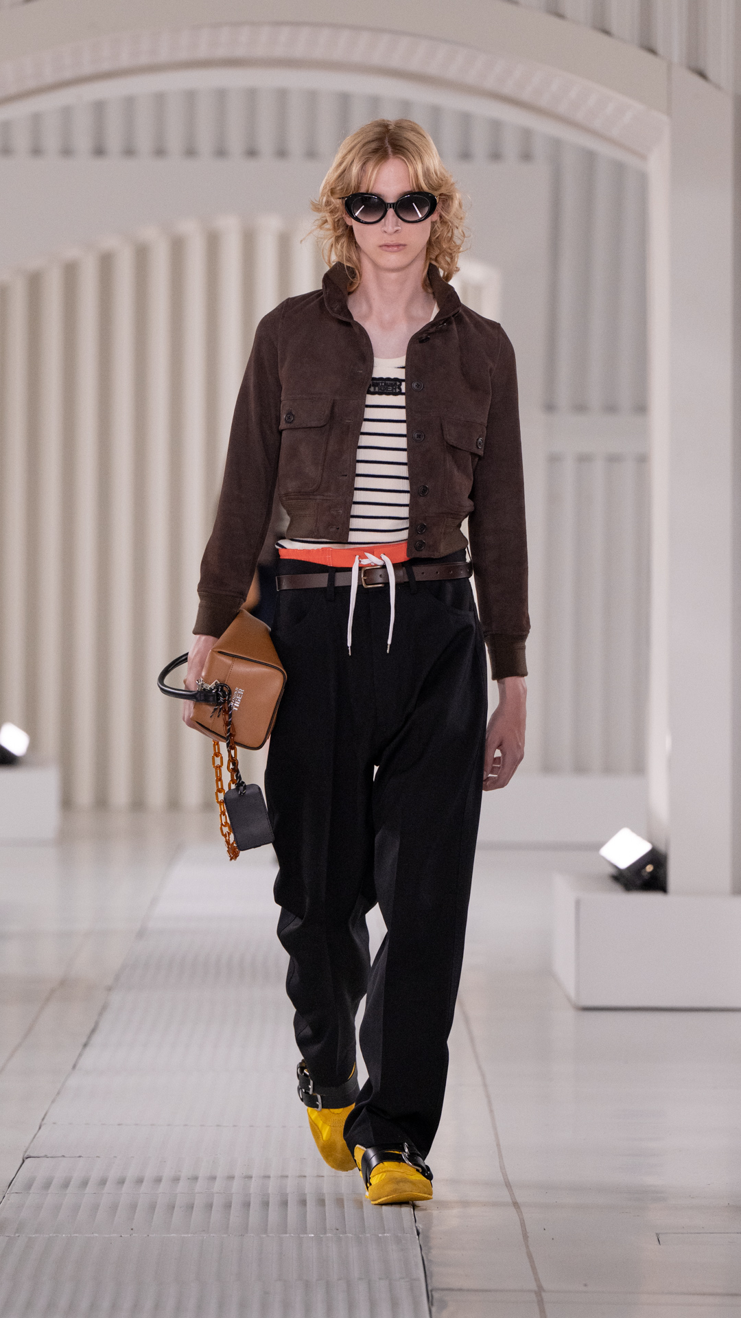 Bên cạnh sự đa dạng về phom dáng, bộ sưu tập còn là một cuộc đối thoại thú vị về chất liệu. Chất liệu da khẳng định dấu ấn mạnh mẽ qua các thiết kế áo khoác Biker phom rộng và chân váy mini với chi tiết khóa kéo đặc trưng. Chất liệu da lộn lại mang đến một nét chấm phá mềm mại hơn qua những mẫu áo khoác Varsity, phối cùng chân váy dài ngang gối được xếp li bất đối xứng. Những mẫu áo Nỉ phom rộng hai mặt làm từ neoprene và nylon in họa tiết cùng áo hoodie và áo khoác chần bông, tất cả bừng sáng trên bảng màu hồng của thập niên 80, khép lại bản giao hưởng đầy màu sắc.