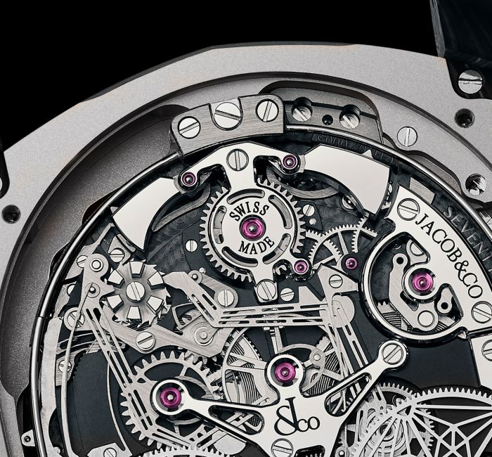 Được biết, Tourbillon ba trục là một cơ cấu vô cùng phức tạp, tạo ra nhiều thách thức đối với nhà chế tác. Ở phiên bản này, 2 cụm tourbillon ba trục sẽ chuyển động với tần suất 24 giây, 8 giây và 30 giây dọc theo ba trục quay do Jacob & Co. thiết lập để tạo nên những vũ điệu đẹp mắt. Cơ cấu phức tạp tiếp theo trên siêu phẩm này là cơ cấu điểm chuông theo phút thế hệ mới, điểm chuông theo mốc 60 phút, 10 phút và 60 giây khác biệt hoàn toàn với cơ cấu truyền thống. Các chuyên gia gọi đây là cơ chế điểm chuông theo dãy số thập phân rất hiếm thấy trong thế giới đồng hồ cao cấp.