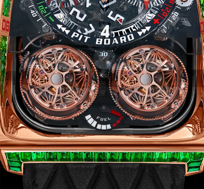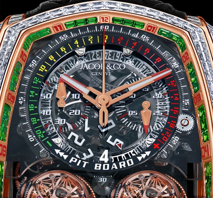 Ngoài ra, một yếu tố nổi bật khác của Twin Turbo Furious là tính năng bấm giờ một nút bấm tích hợp vào phần núm vặn dạng tay quay tại hướng 3 giờ để kích hoạt, tạm dừng và reset phép đo thời gian. Không hổ danh là nhà chế tác bậc thầy trong thế giới đồng hồ Thụy Sĩ, Jacob & Co. còn khéo léo ứng dụng cách thức hoạt động của bảng đếm thời gian chênh lệch Pit Board thường xuất hiện trong các giải đua ô tô cổ điển vào bộ đếm chronograph của mẫu đồng hồ này.