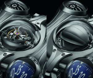 Được đặt lên trên đỉnh là tourbillon “bay” 60 giây với tấm chắn có thể được thu vào, cùng cơ chế vận hành các vòm hiển thị giờ và phút vuông góc với bộ máy. Tuabin điều chỉnh được ghép với rôto. Tất cả đều có thể theo dõi qua lớp dày vật liệu phát sáng hiệu suất cao có tên AGT Ultra.