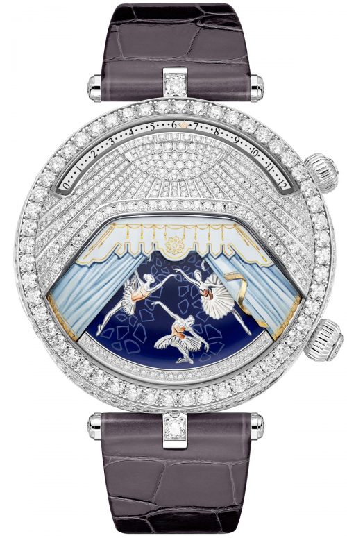 Mang đến nguồn cảm hứng cho kiệt tác của Balanchine, Van Cleef & Arpels đã đặt từng tiết mục trên cổ tay vào bộ ba chiếc đồng hồ sử dụng kỹ thuật đính đá quý, sơn mài và chế tác đồng hồ cơ học để chắt lọc sự lấp lánh của vở ba lê, hoàn chỉnh với các vũ công và đệm nhạc. Không có chi tiết nào là quá nhỏ: ngay cả những tấm rèm và vòm bằng kim loại của mỗi chiếc đồng hồ cũng gợi lên một địa điểm thực tế: Opéra Garnier ở Paris, Marinsky ở St Petersburg và Trung tâm Lincoln ở New York.